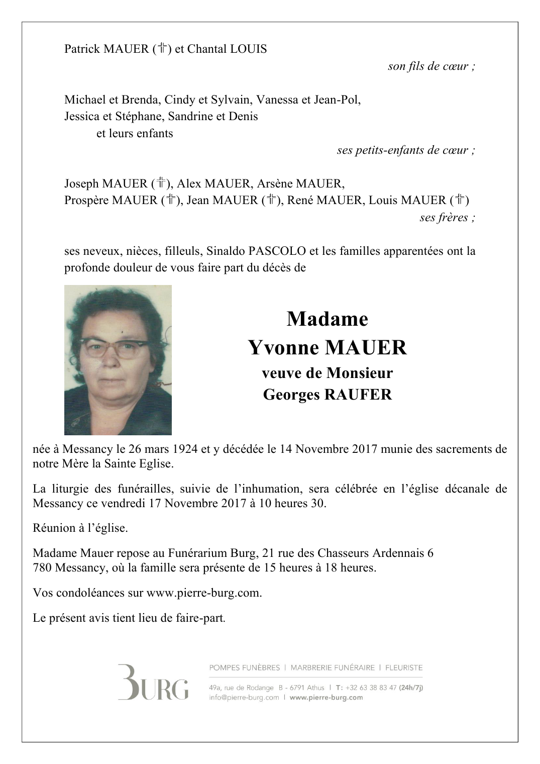 Décédée à Messancy (6780) le mardi 14 novembre 2017 à l'âge de 93 ans