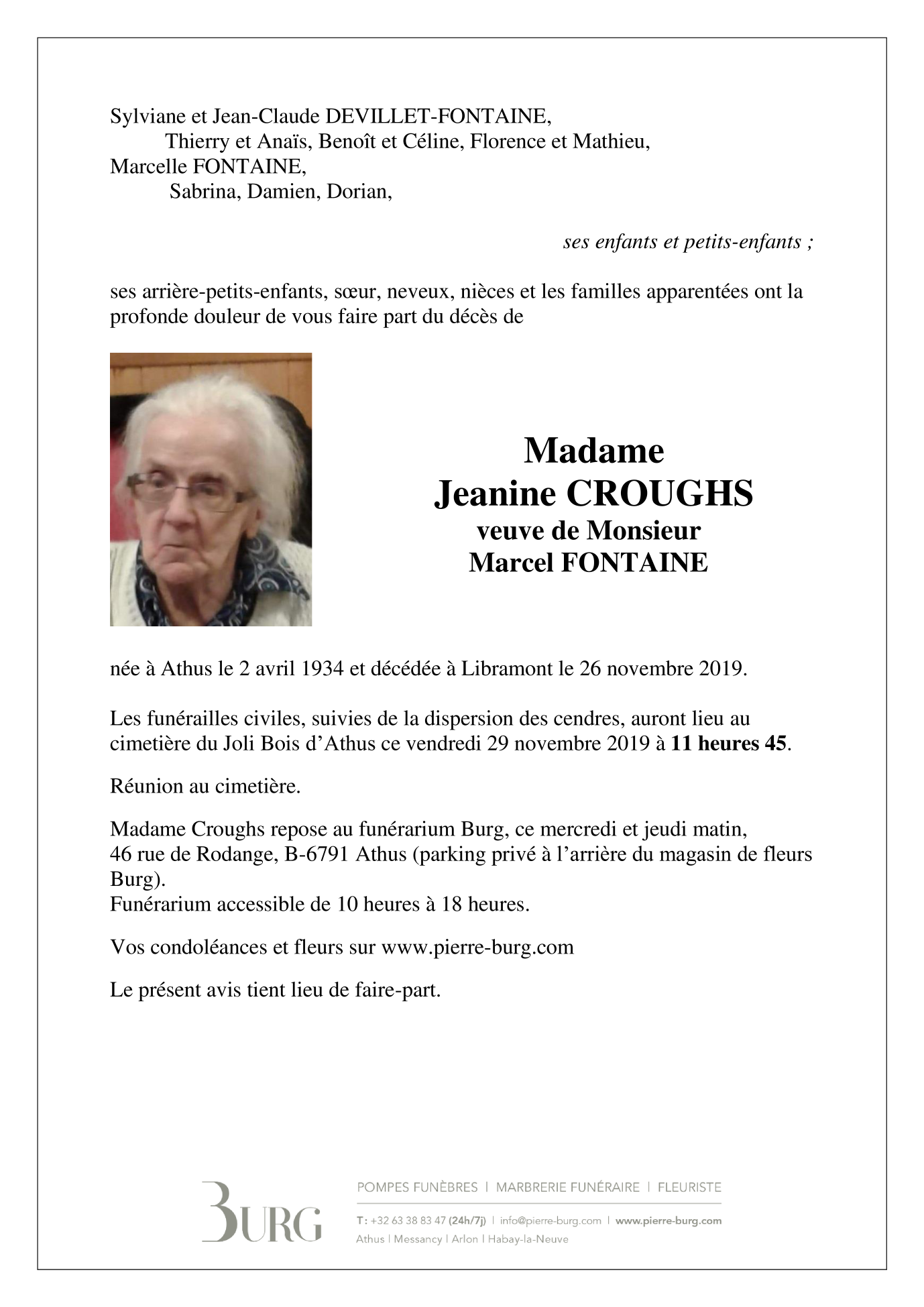 Décédée à Libramont-Chevigny (6800) le mardi 26 novembre 2019 à l'âge de 85 ans