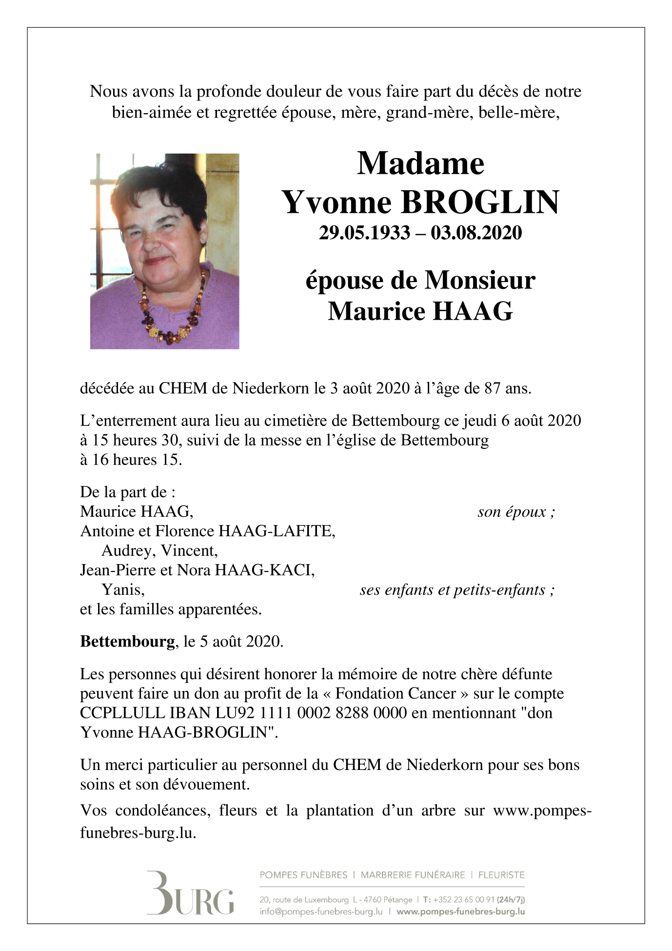 Décédée à Differdange/Liberte  (4602, Luxembourg) le lundi 3 août 2020 à l'âge de 87 ans