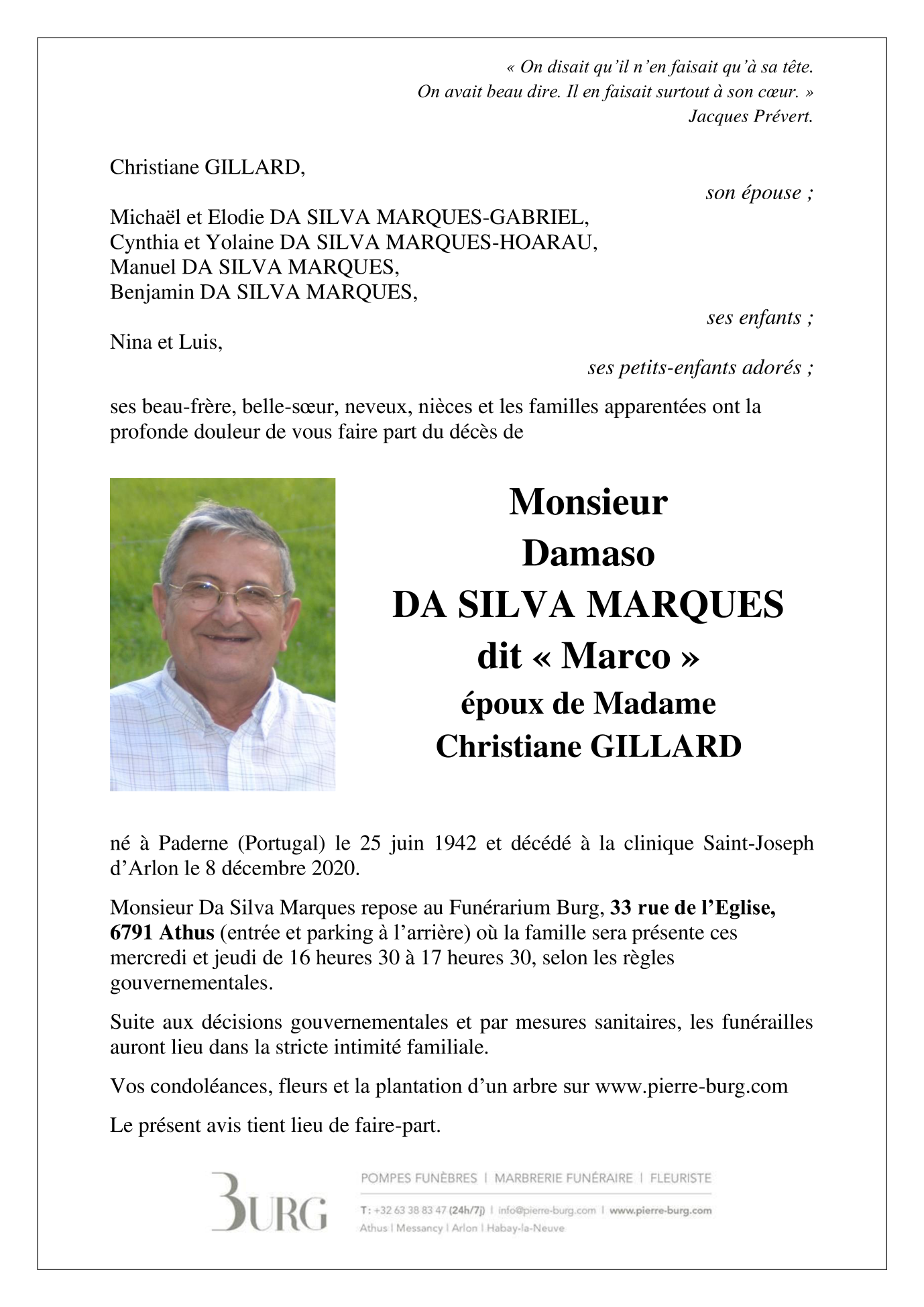 Décédé à Arlon (6700) le mardi 8 décembre 2020 à l'âge de 78 ans
