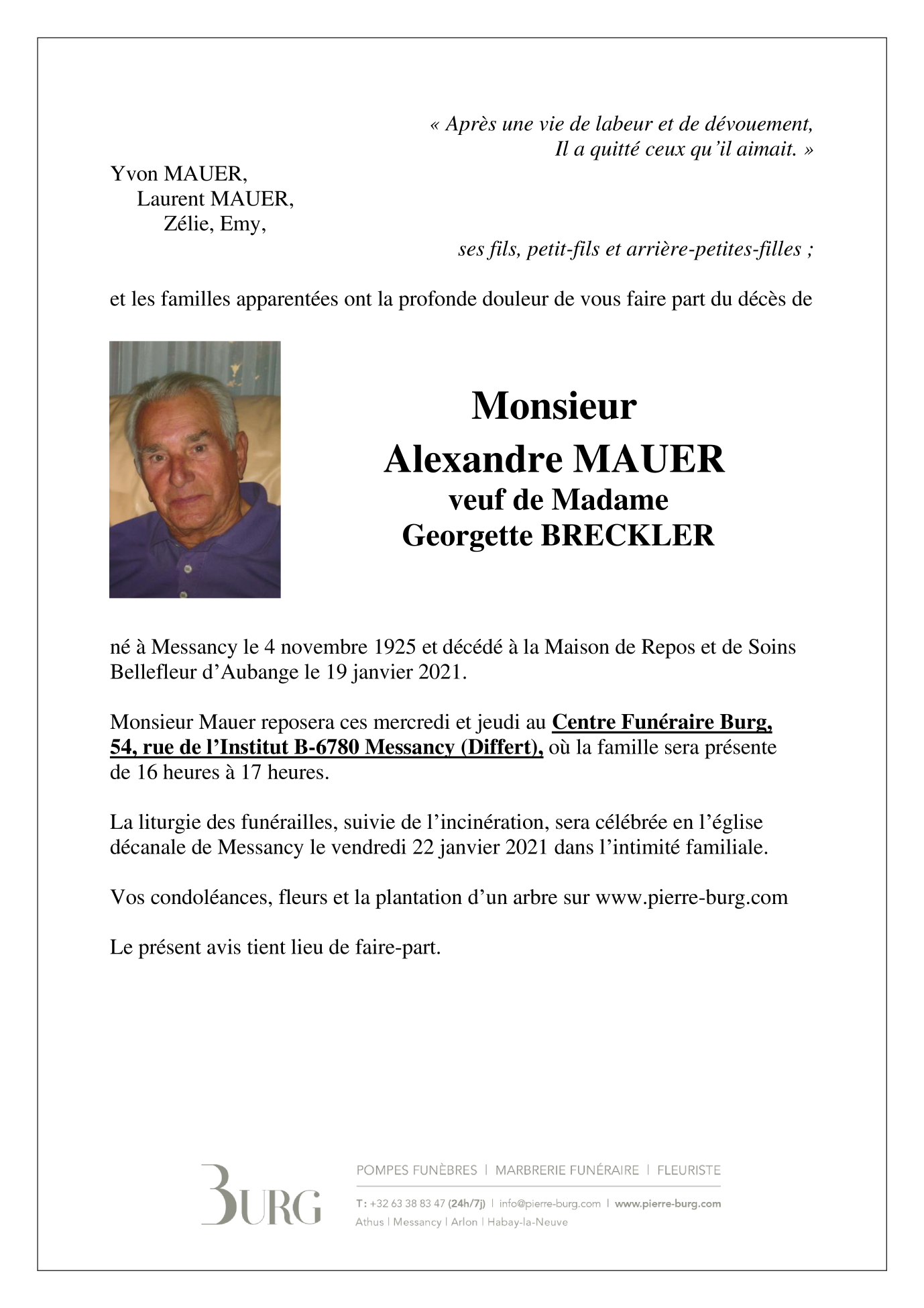 Décédé à Aubange (6790) le mardi 19 janvier 2021 à l'âge de 95 ans