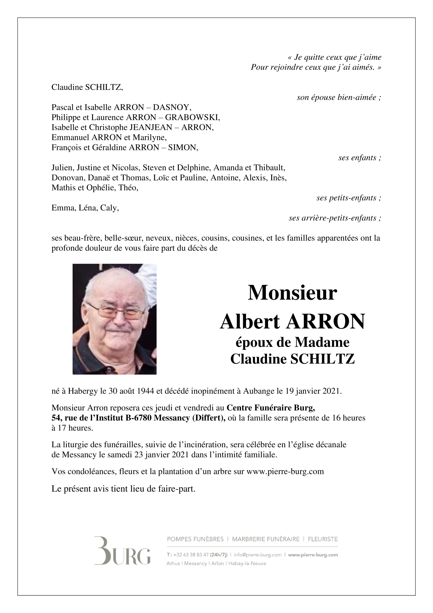 Décédé à Aubange (6790) le mardi 19 janvier 2021 à l'âge de 76 ans