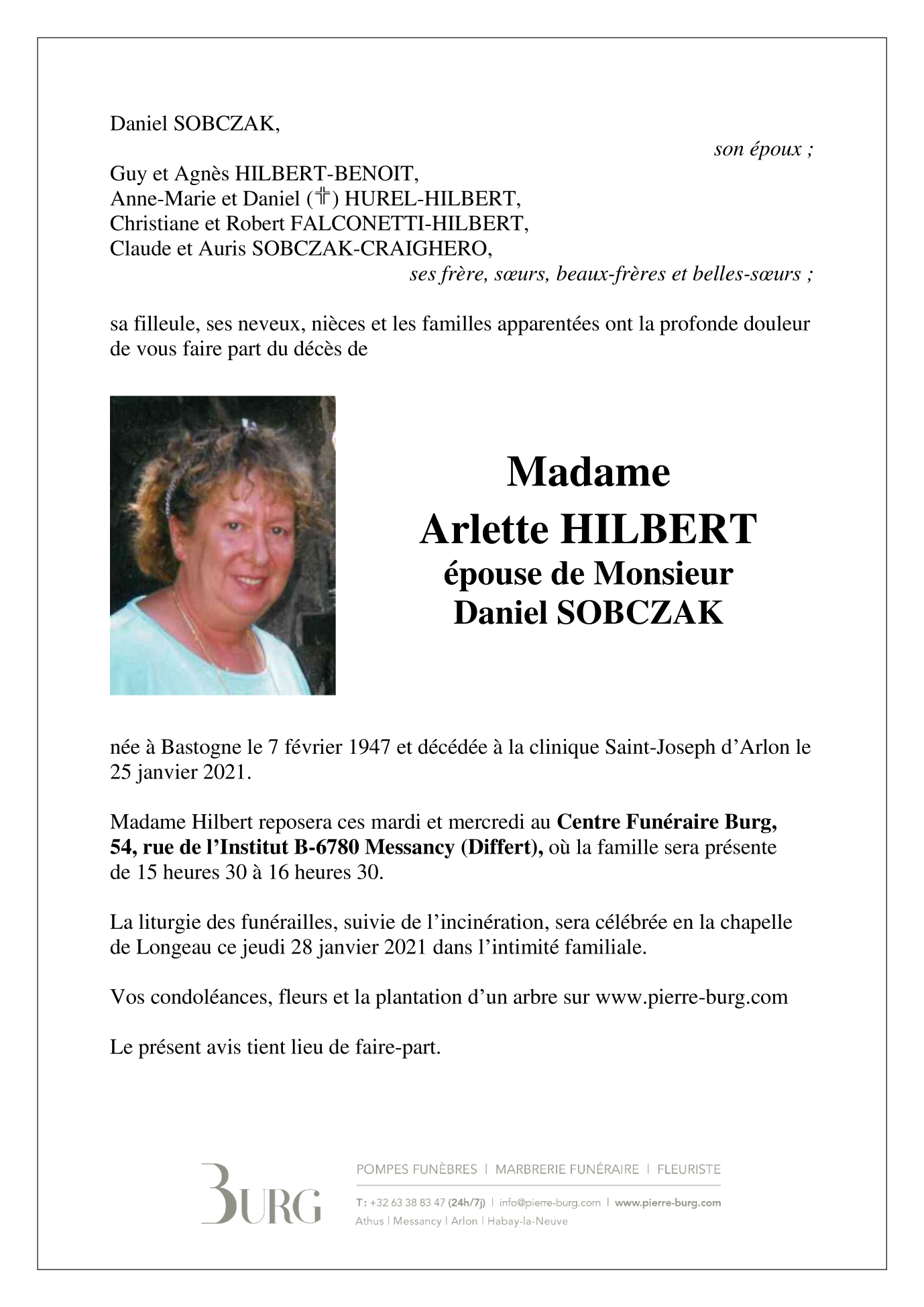 Décédée à Arlon (6700) le lundi 25 janvier 2021 à l'âge de 73 ans