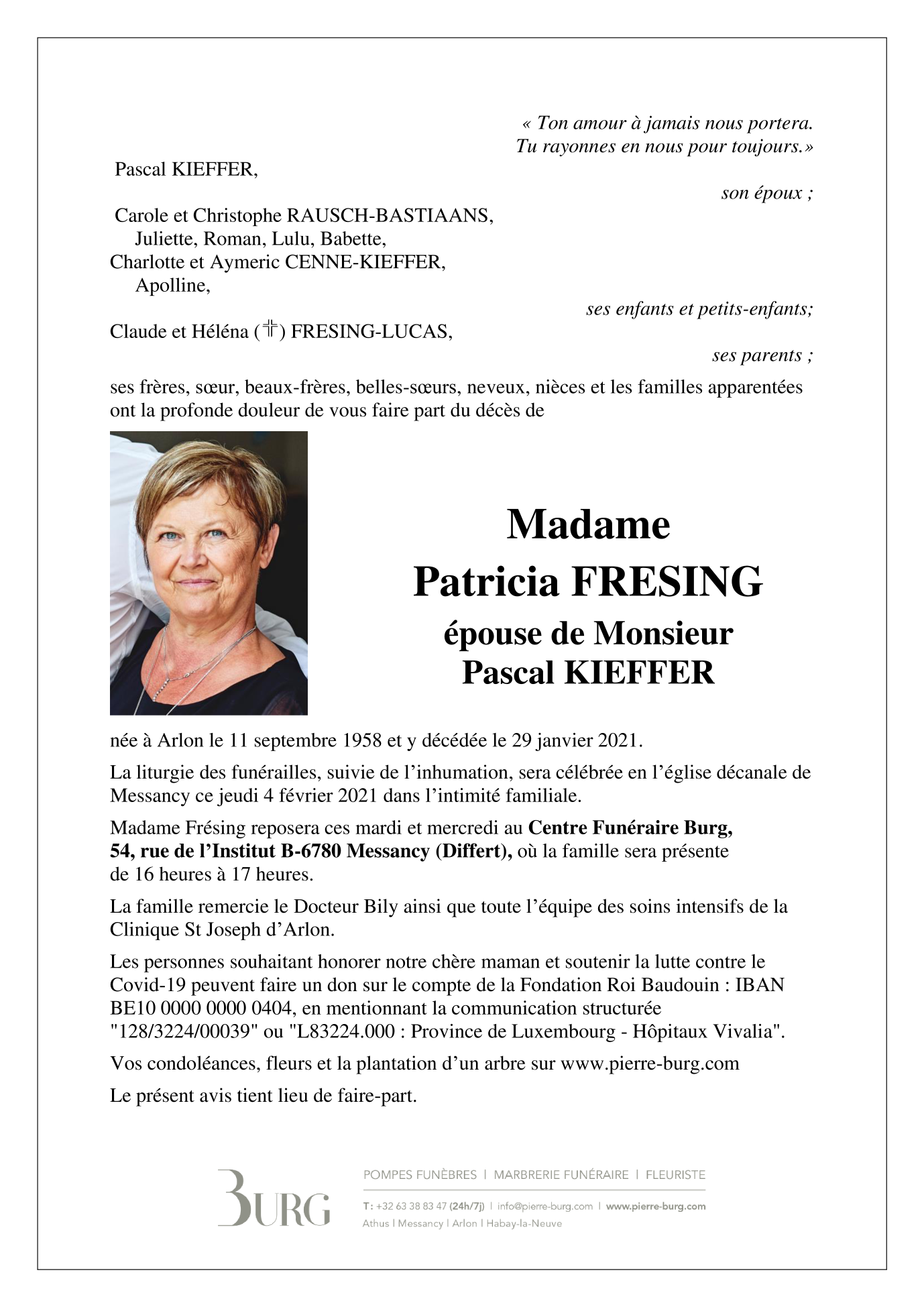 Décédée à Arlon (6700) le vendredi 29 janvier 2021 à l'âge de 62 ans