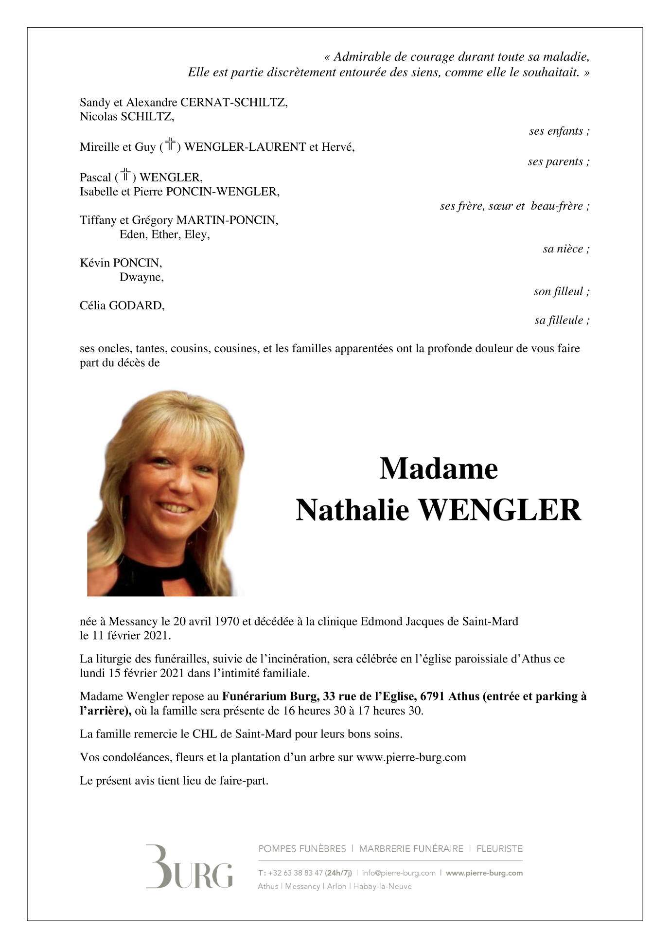Décédée à Saint-Mard (6762) le jeudi 11 février 2021 à l'âge de 50 ans