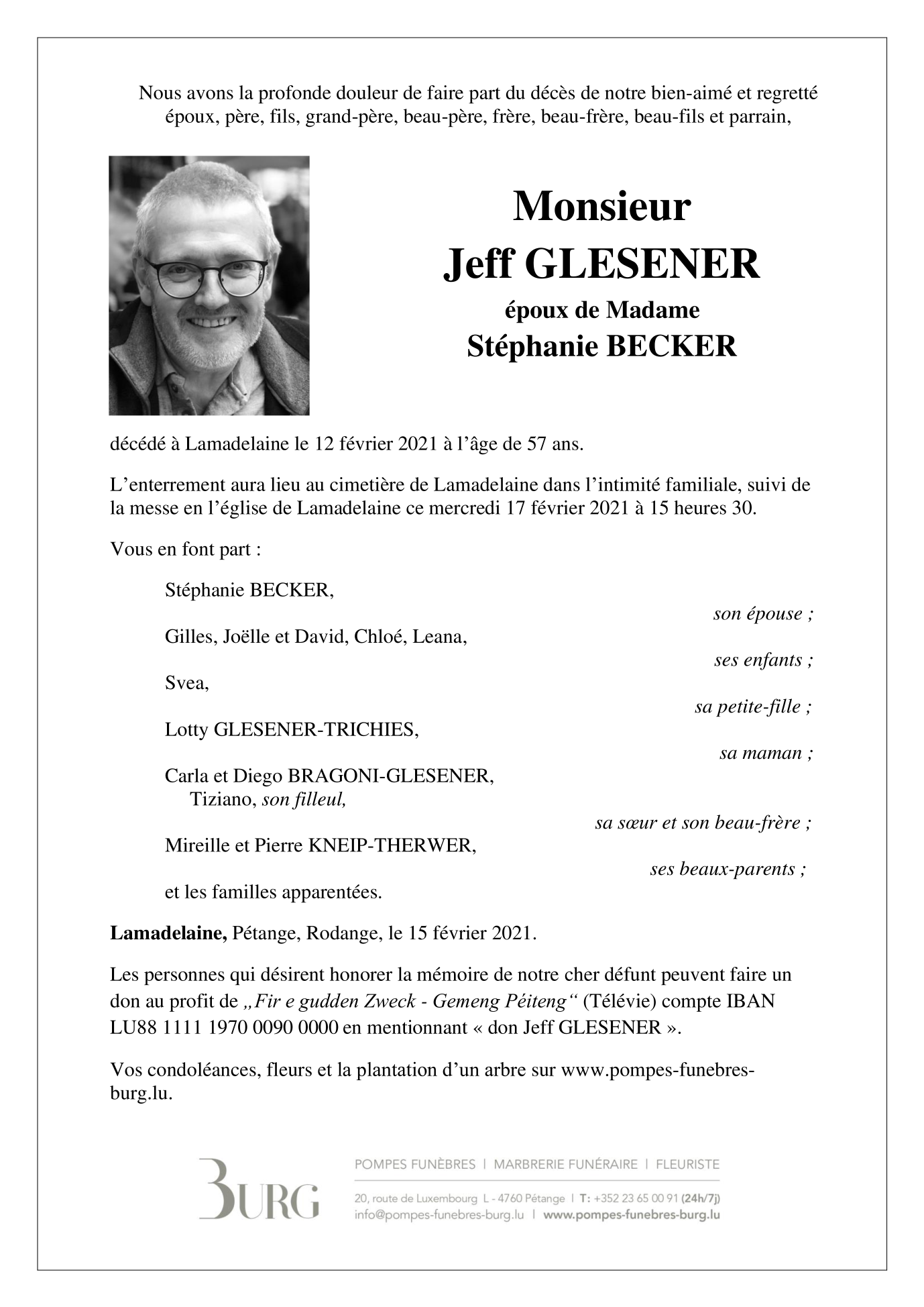 Décédé à Lamadelaine/Thill  (4888, Luxembourg) le vendredi 12 février 2021 à l'âge de 57 ans