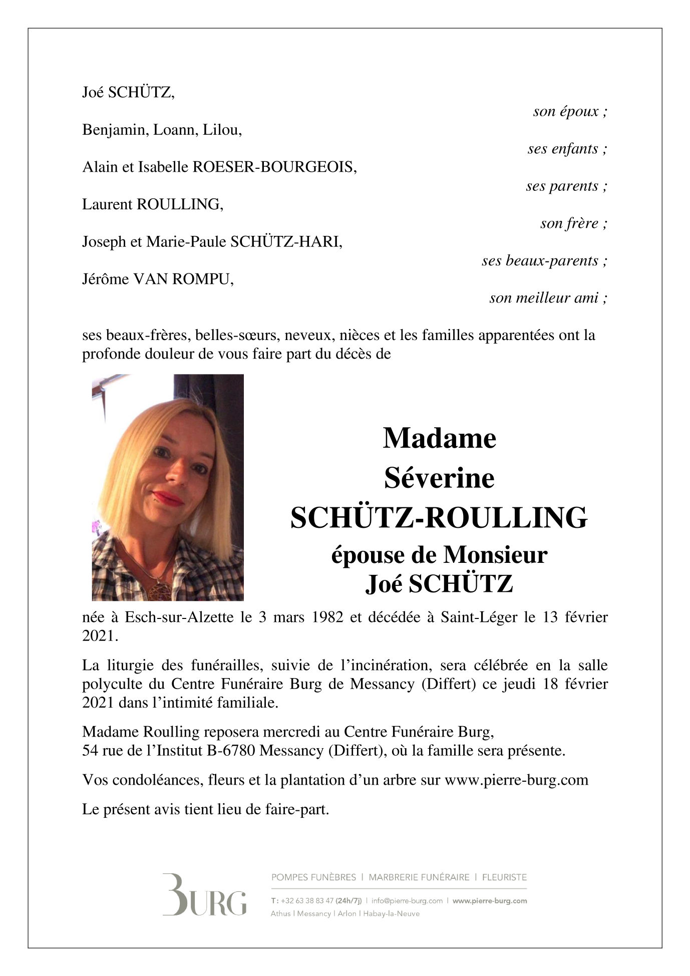 Décédée à Saint-Léger (Lux.) (6747) le samedi 13 février 2021 à l'âge de 38 ans