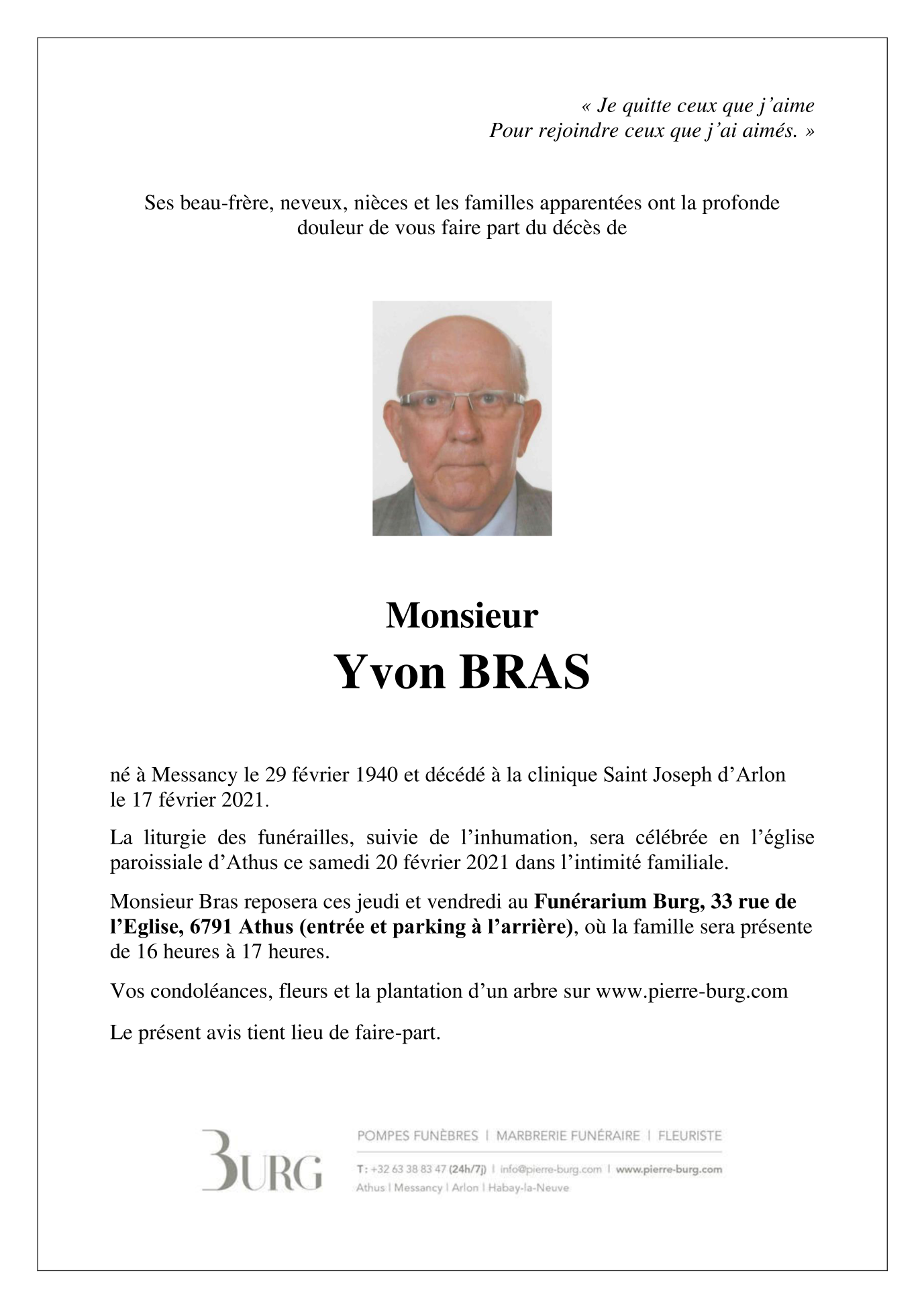 Décédé à Arlon (6700) le mercredi 17 février 2021 à l'âge de 80 ans