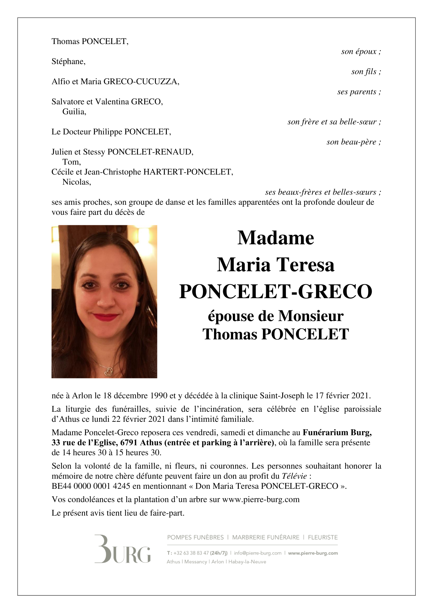 Décédée à Arlon (6700) le mercredi 17 février 2021 à l'âge de 30 ans