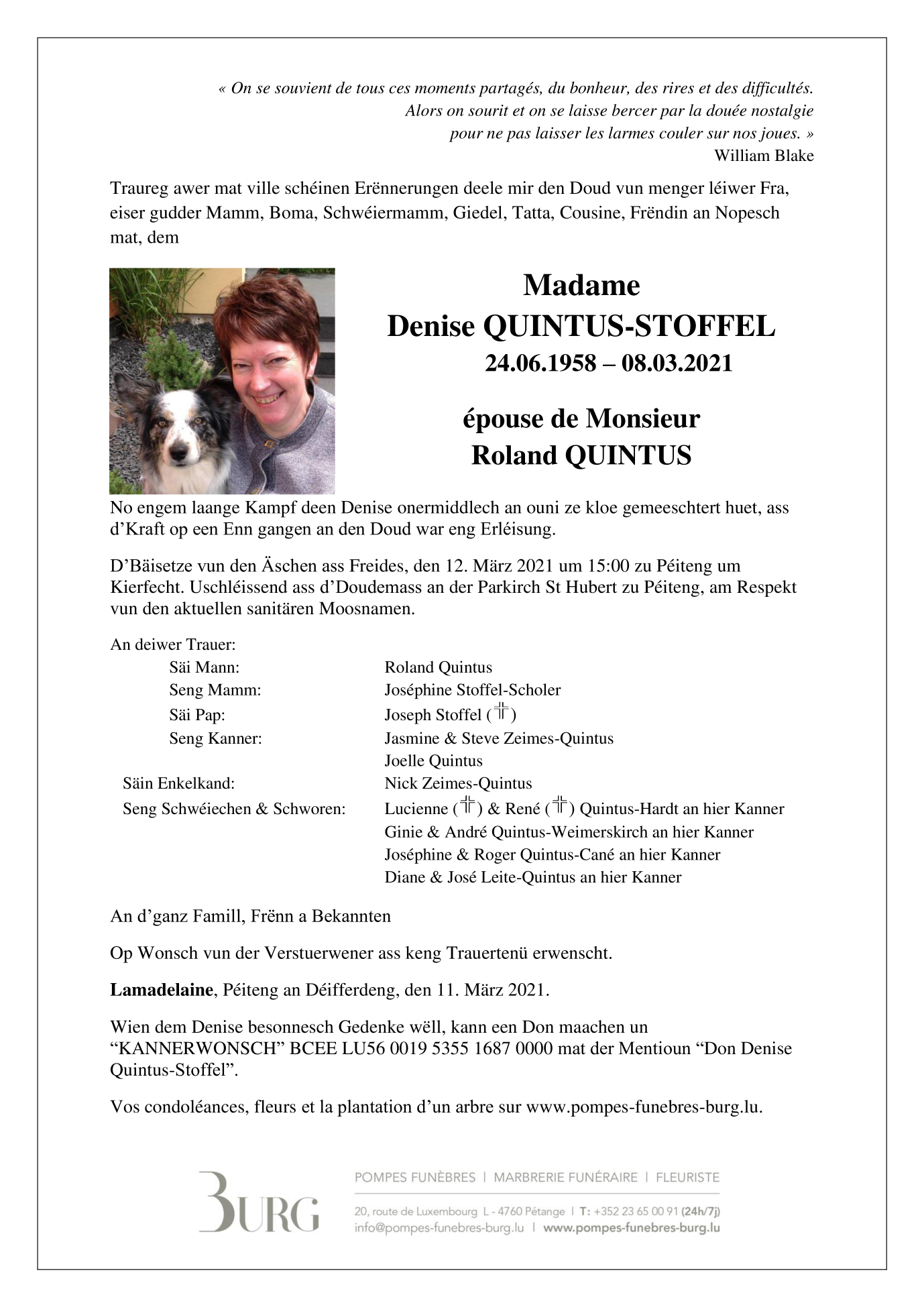 Décédée à Esch-Sur-Alzette/Mayrisch  (4240, Luxembourg) le lundi 8 mars 2021 à l'âge de 62 ans