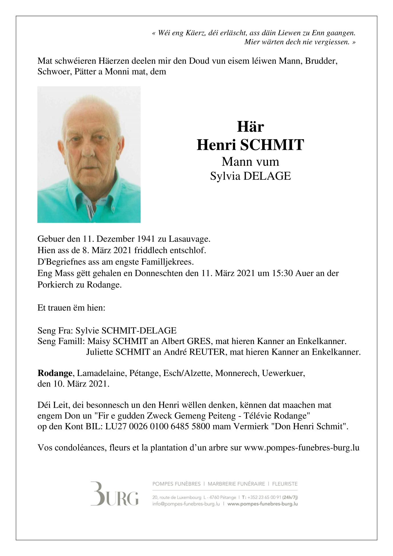 Décédé à Esch-Sur-Alzette/Mayrisch  (4240, Luxembourg) le lundi 8 mars 2021 à l'âge de 79 ans