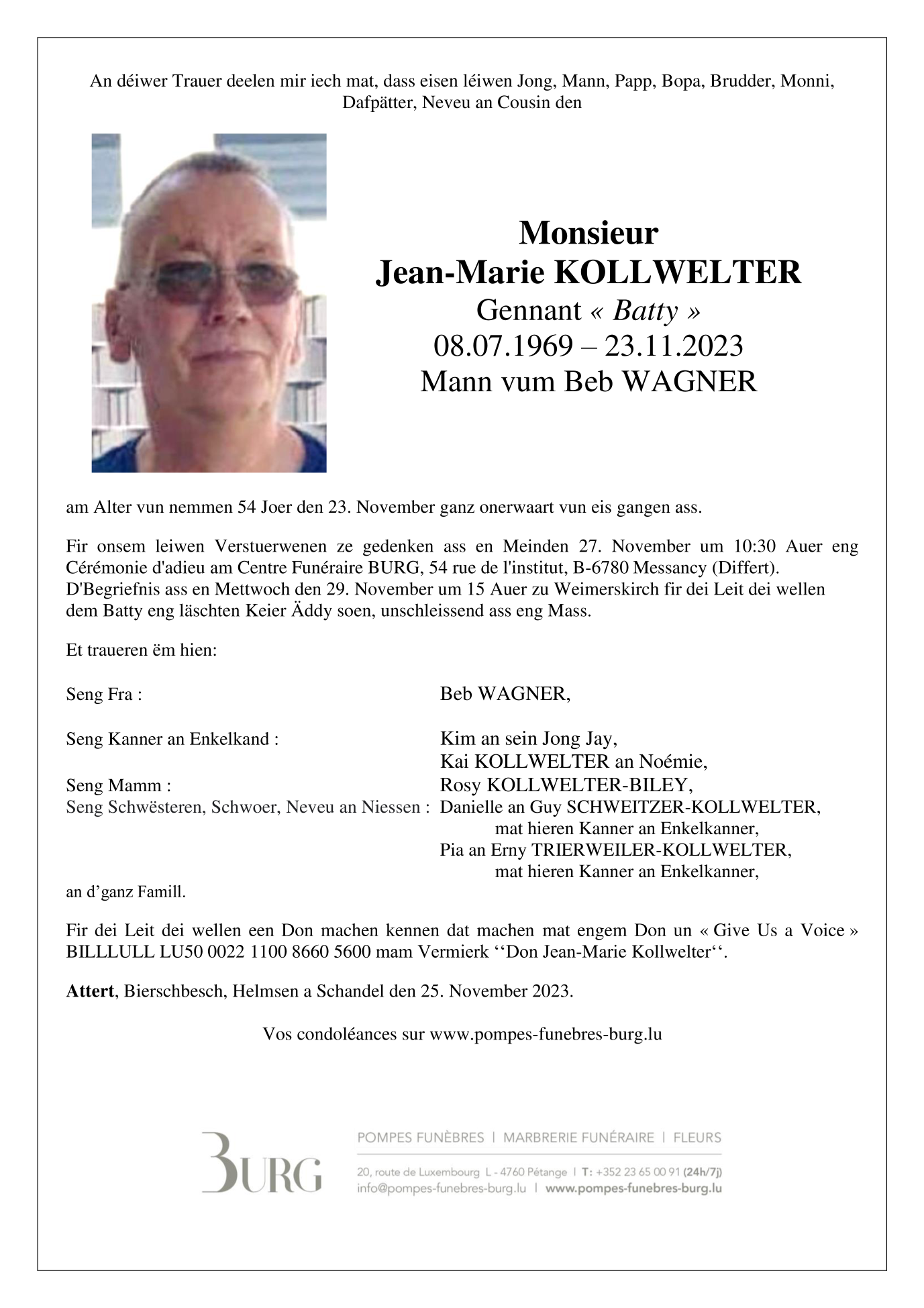 Décédé à Attert (6717) le jeudi 23 novembre 2023 à l'âge de 54 ans