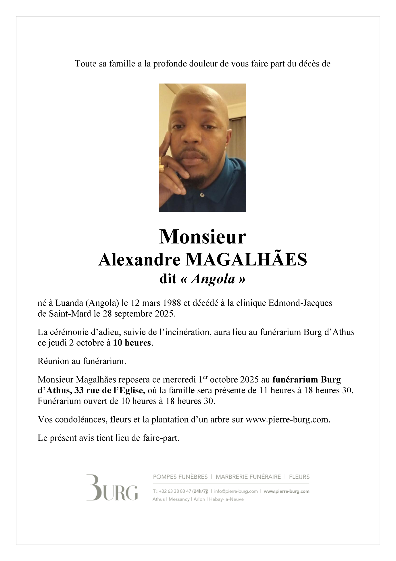 Décédé à Saint-Mard (6762) le dimanche 28 septembre 2025 à l'âge de 37 ans