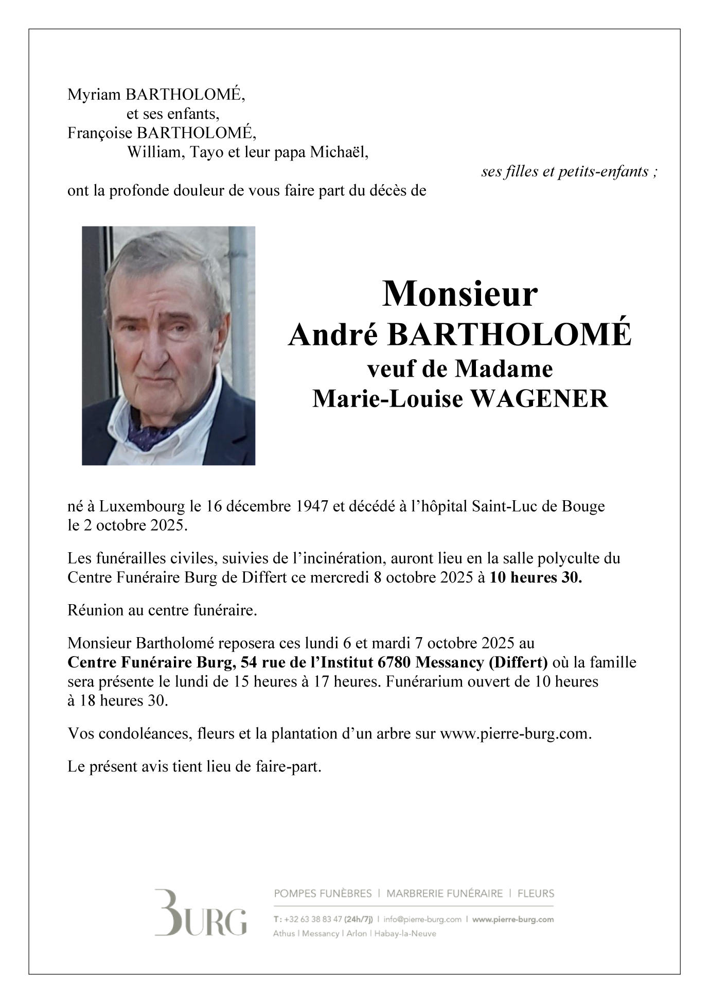Décédé à Bouge (5004) le jeudi 2 octobre 2025 à l'âge de 77 ans