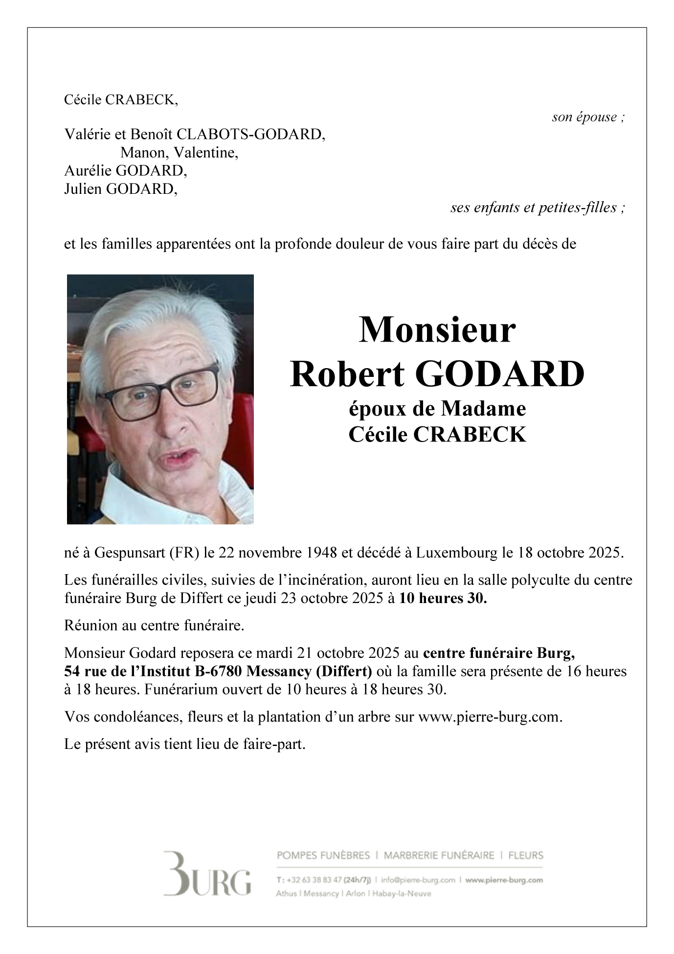 Décédé à Luxembourg/Barble  (1210, Luxembourg) le samedi 18 octobre 2025 à l'âge de 76 ans