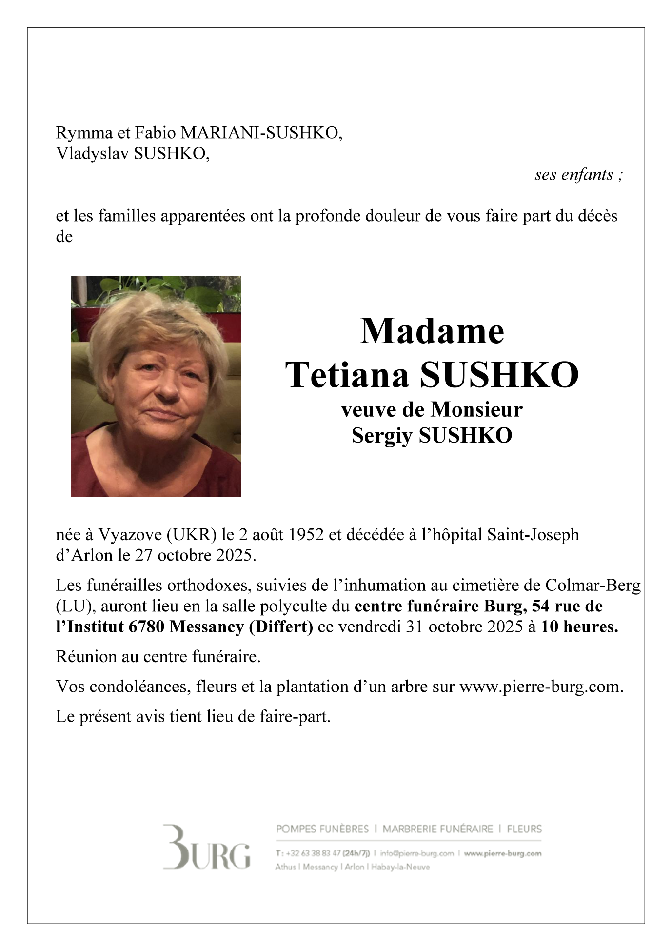 Décédée à Arlon (6700) le lundi 27 octobre 2025 à l'âge de 73 ans