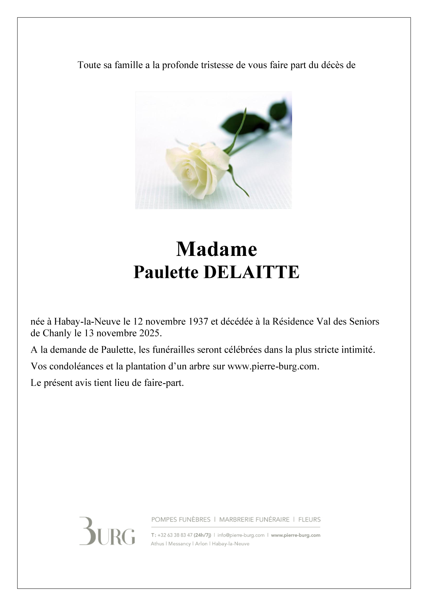 Décédée à Chanly (6921) le jeudi 13 novembre 2025 à l'âge de 88 ans