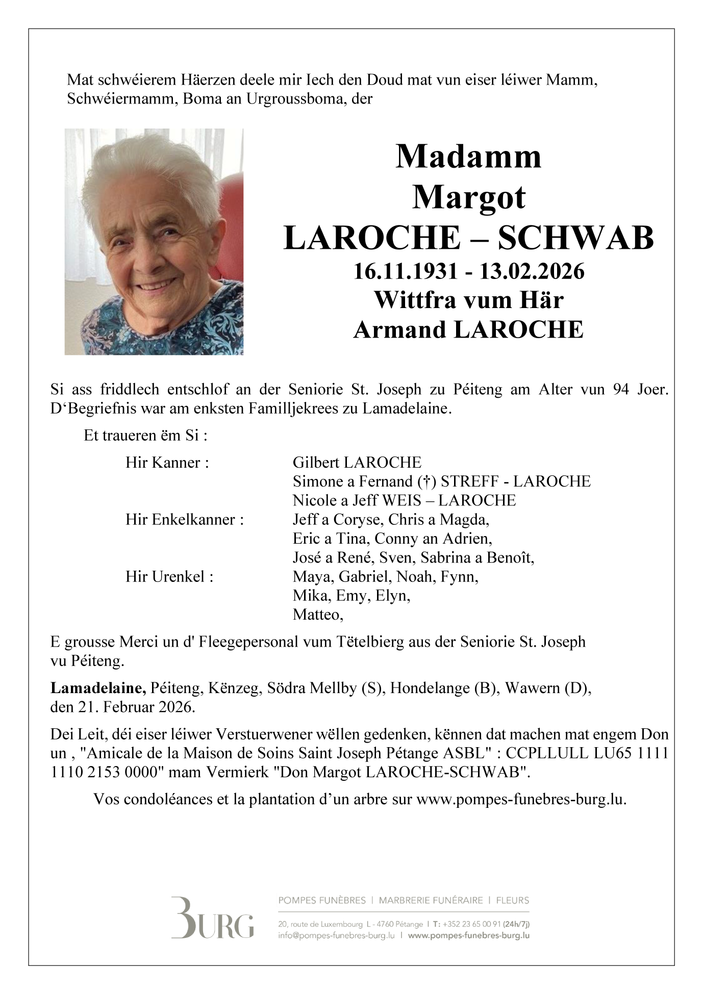 Décédée à Petange/Eglise (4732, Luxembourg) le vendredi 13 février 2026 à l'âge de 94 ans