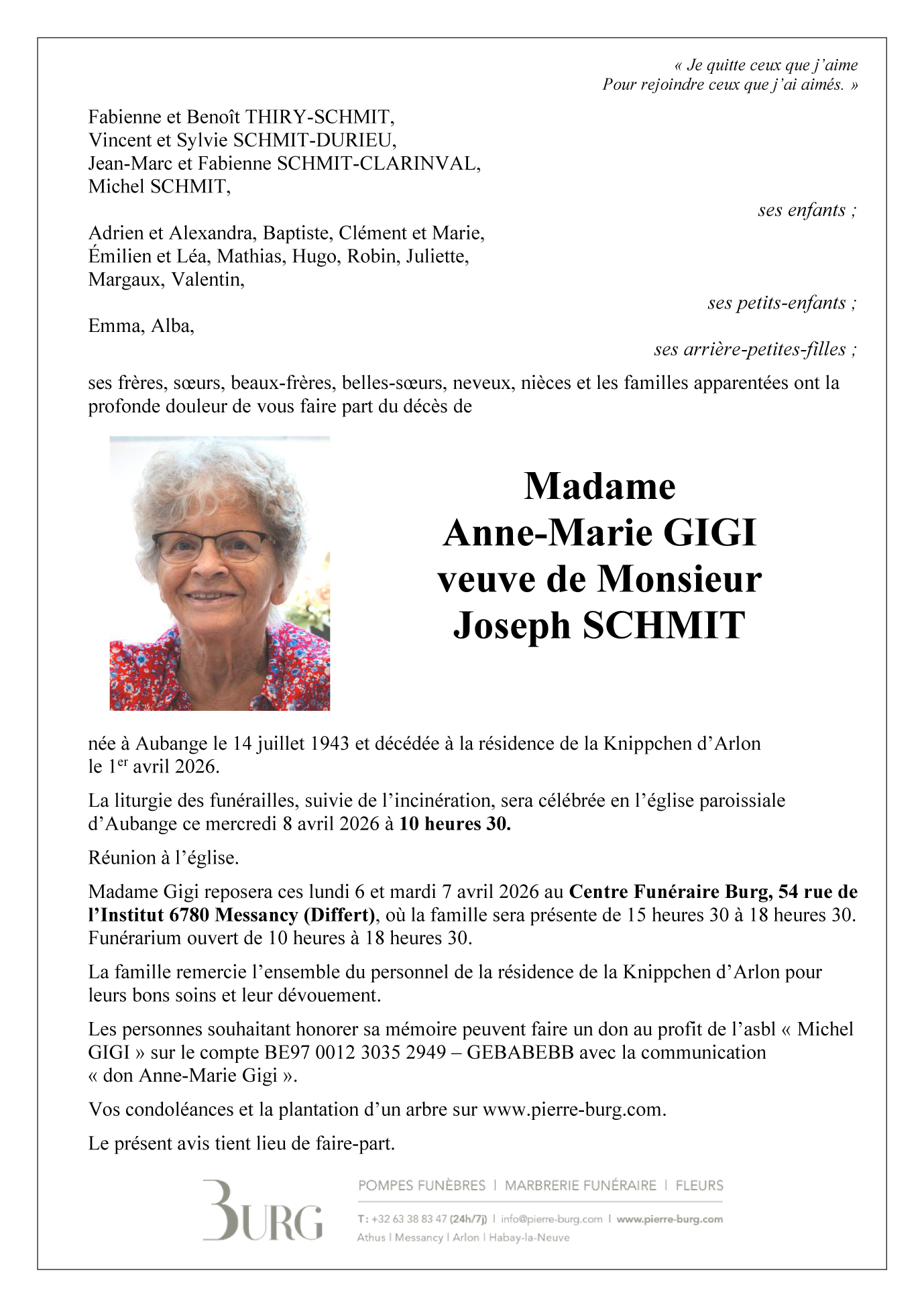 Décédée à Arlon (6700) le mercredi 1 avril 2026 à l'âge de 82 ans
