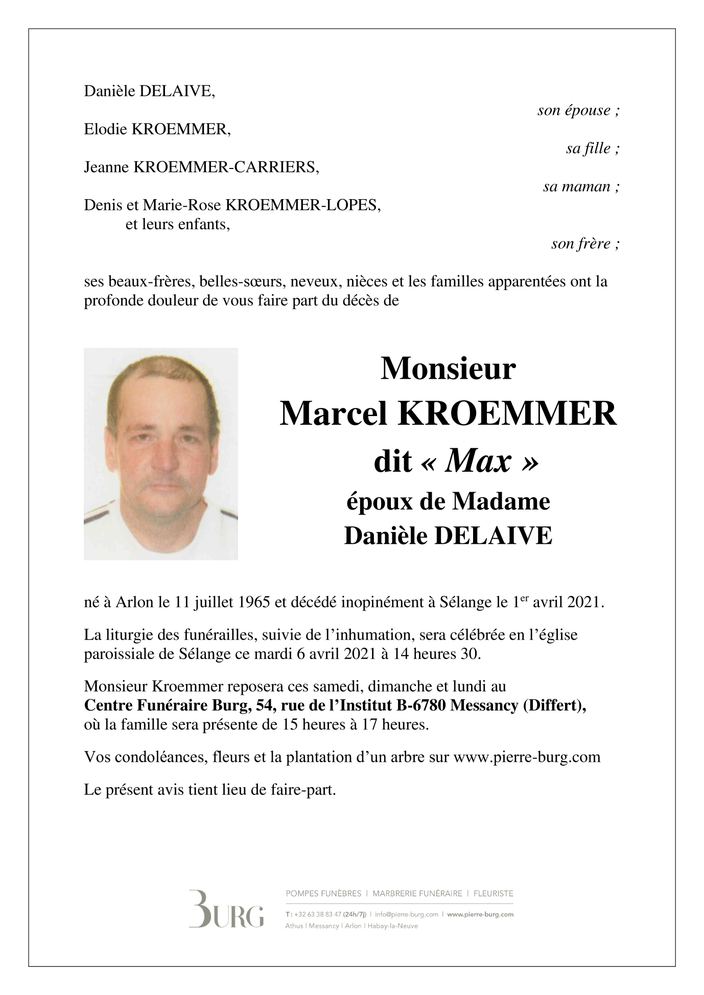 Décédé à Sélange (6781) le jeudi 1 avril 2021 à l'âge de 55 ans