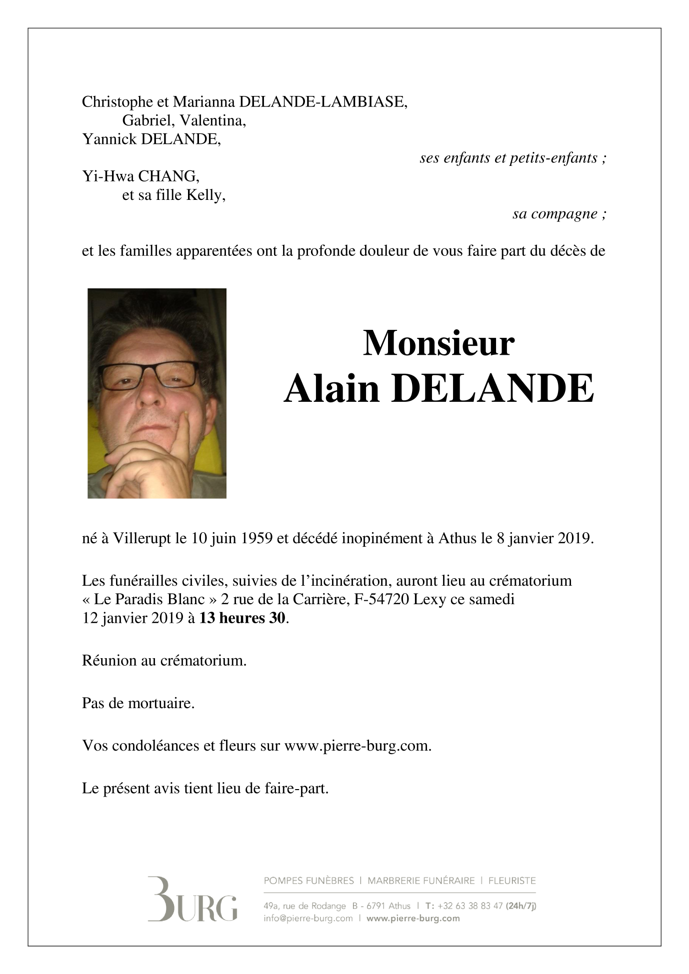 Décédé à Athus (6791) le mardi 8 janvier 2019 à l'âge de 59 ans