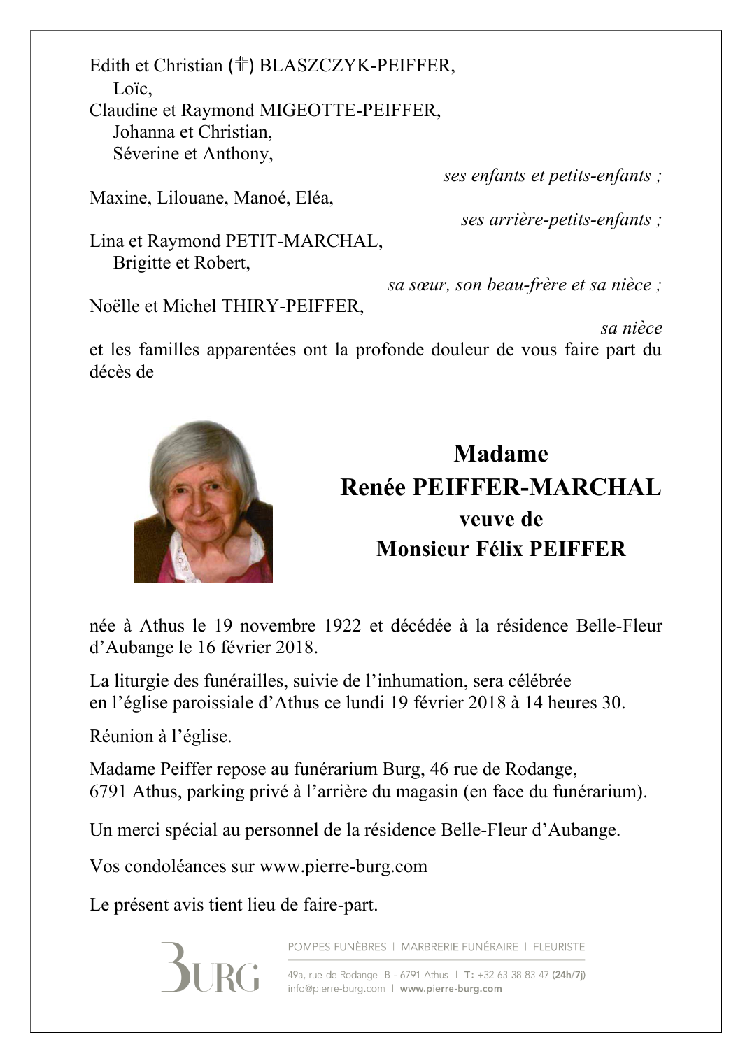 Décédée à Aubange (6790) le vendredi 16 février 2018 à l'âge de 95 ans
