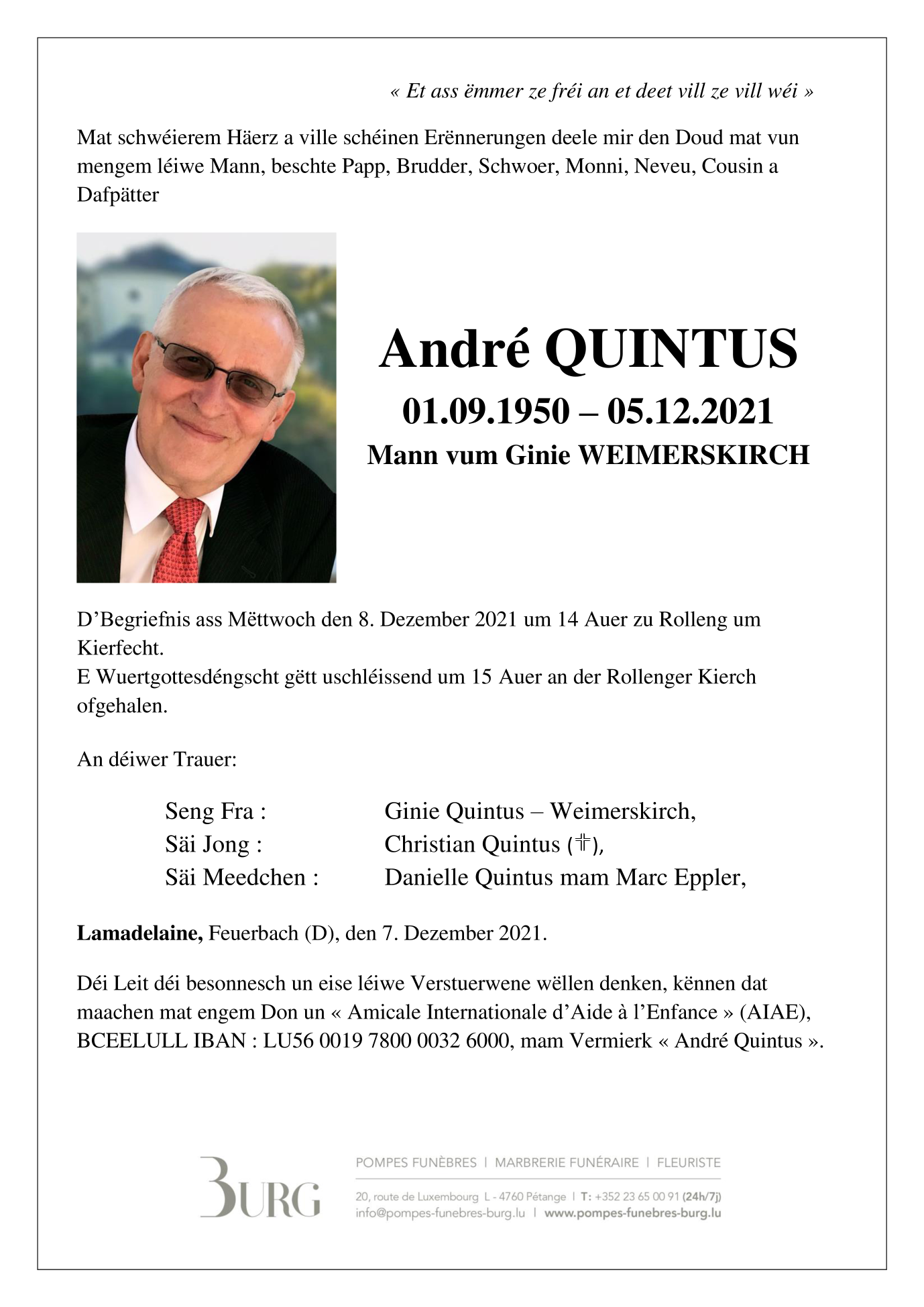Décédé à Luxembourg/Mayrisch  (2141, Luxembourg) le dimanche 5 décembre 2021 à l'âge de 71 ans