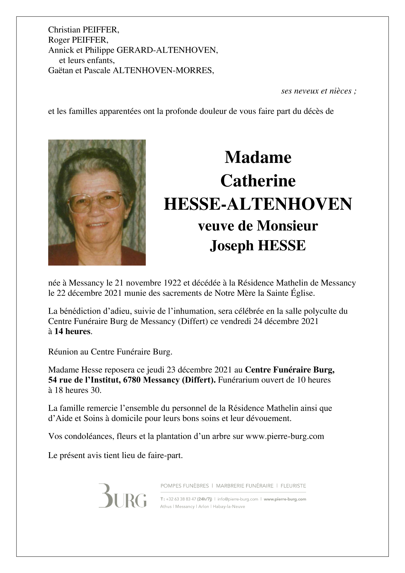 Décédée à Messancy (6780) le mercredi 22 décembre 2021 à l'âge de 99 ans
