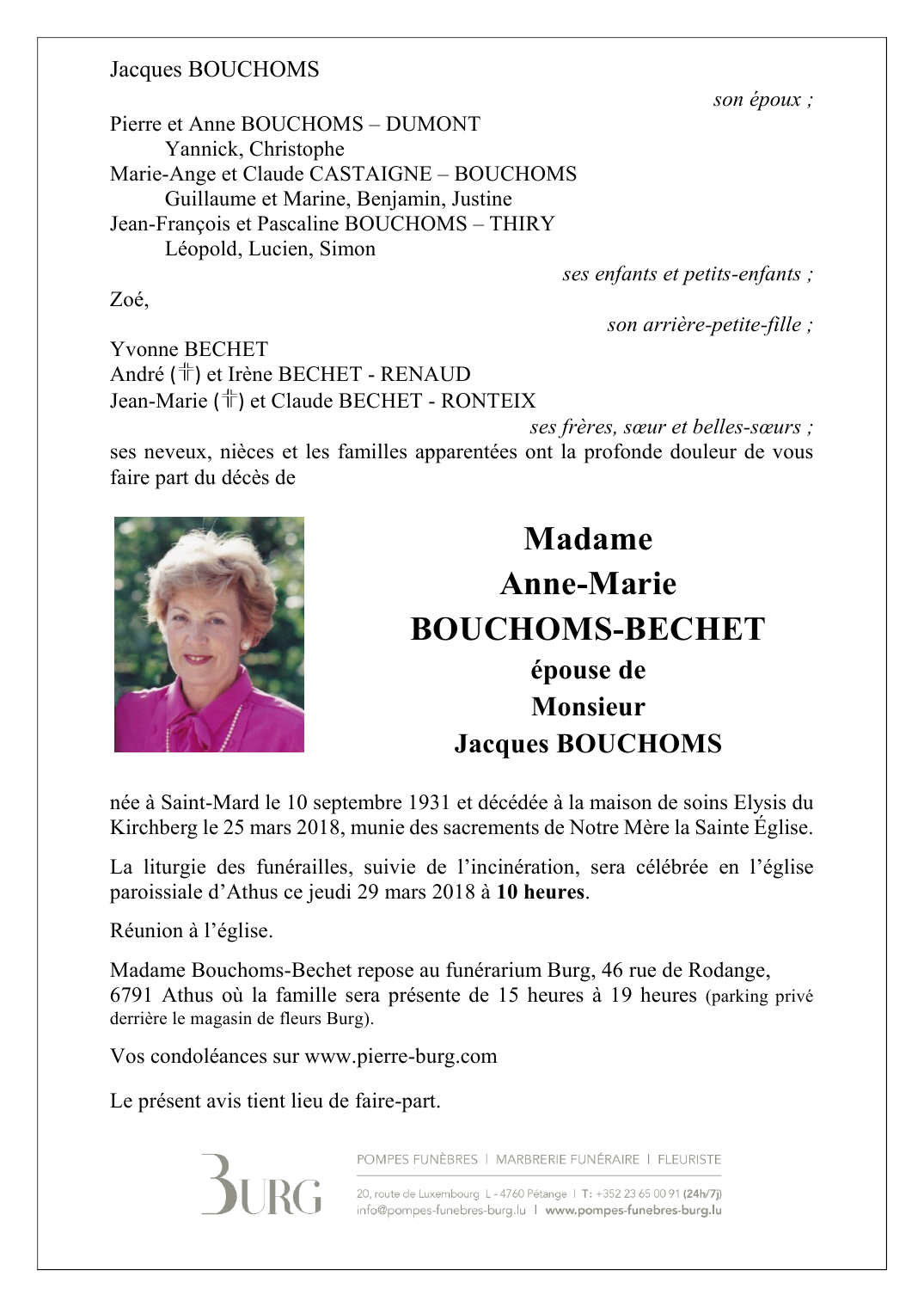 Décédée à Luxembourg (Luxembourg) le lundi 26 mars 2018 à l'âge de 86 ans