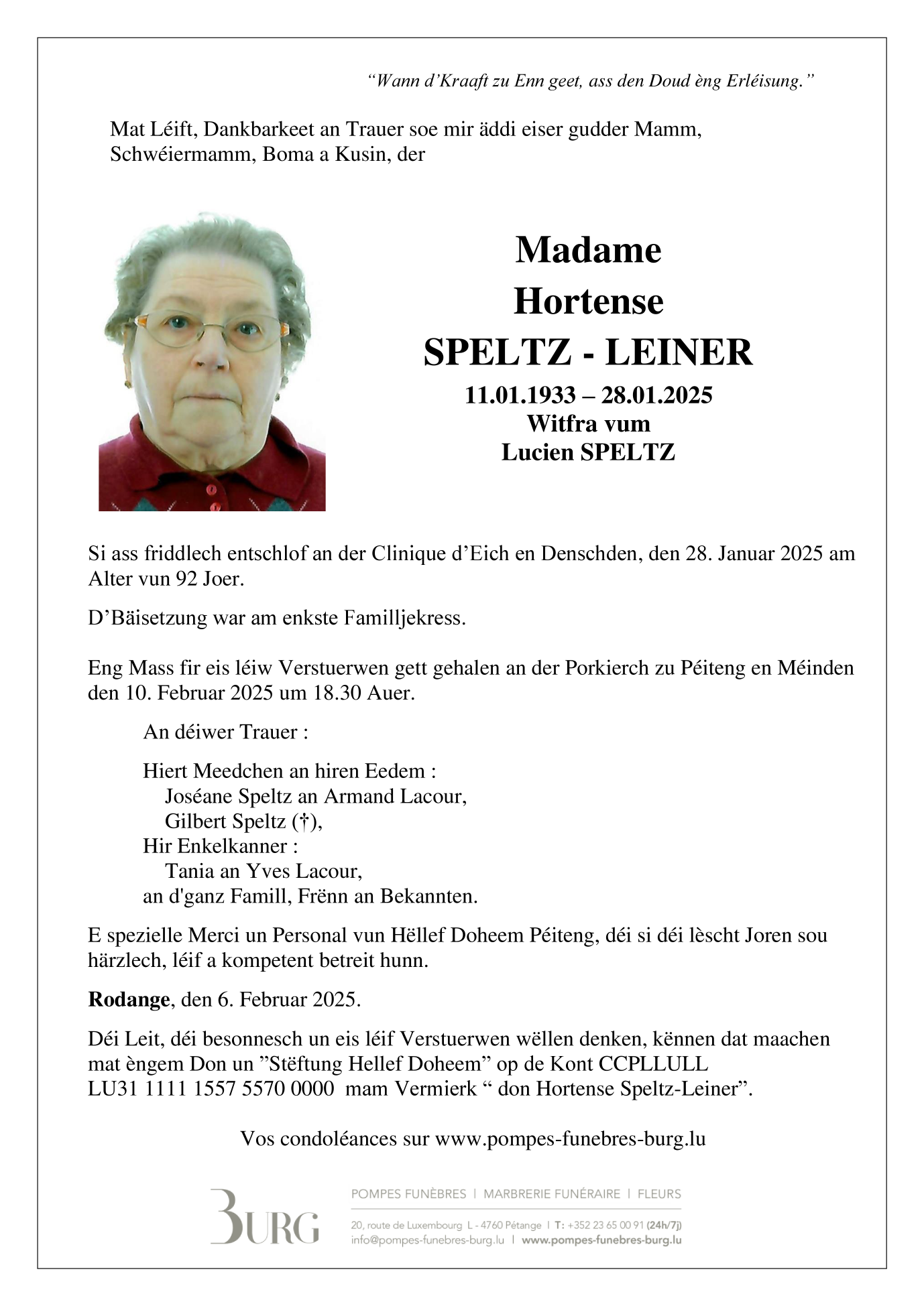 Décédée à Luxembourg/Eich  (1460, Luxembourg) le mardi 28 janvier 2025 à l'âge de 92 ans