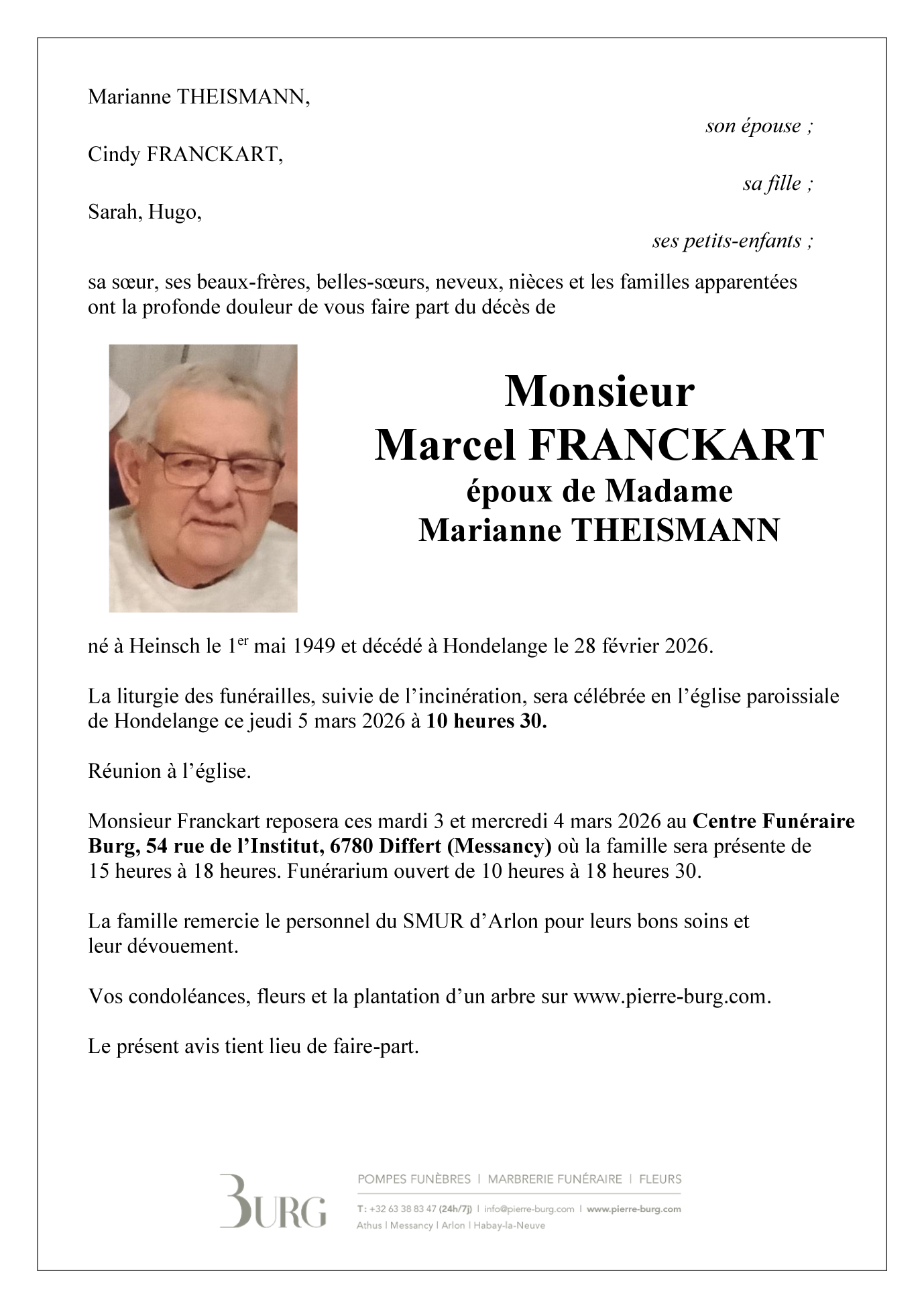 Décédé à Hondelange (6780) le samedi 28 février 2026 à l'âge de 76 ans