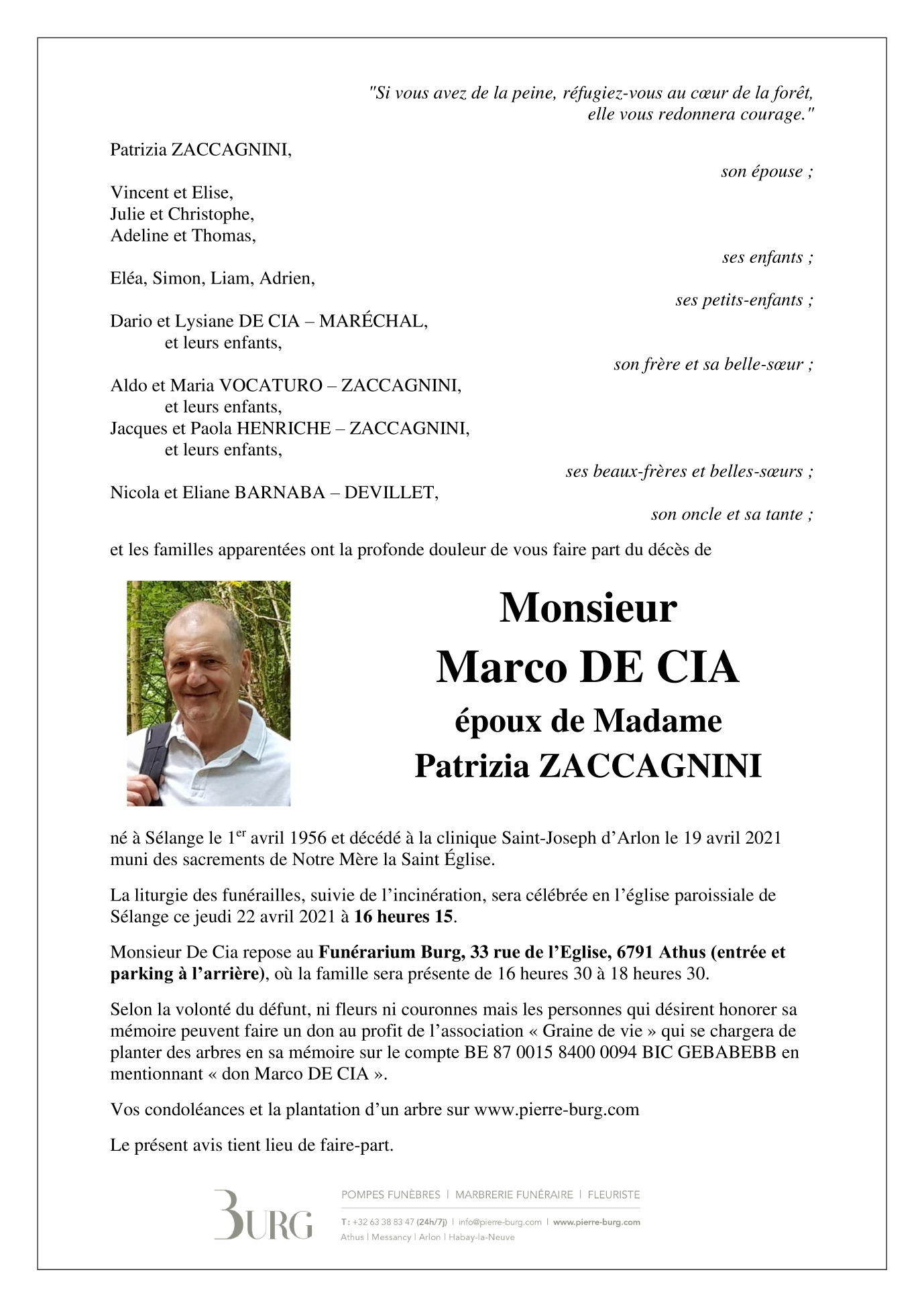 Décédé à Arlon (6700) le lundi 19 avril 2021 à l'âge de 65 ans