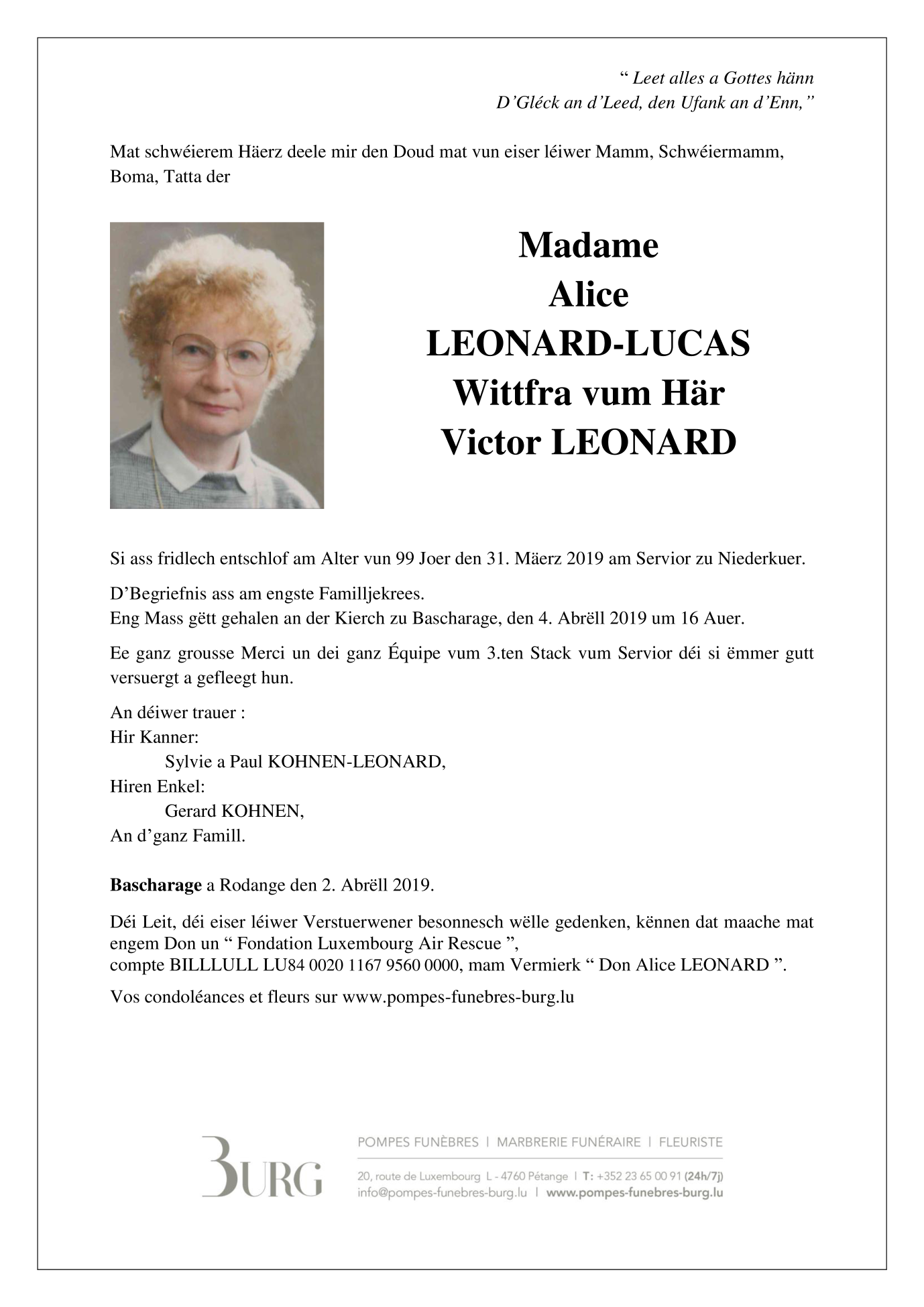 Décédée à Differdange/Petange  (4645, Luxembourg) le dimanche 31 mars 2019 à l'âge de 99 ans