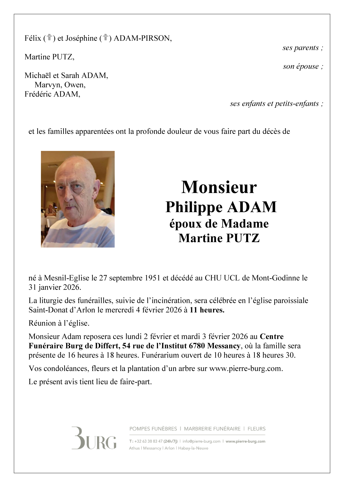 Décédé à Yvoir (5530) le samedi 31 janvier 2026 à l'âge de 74 ans