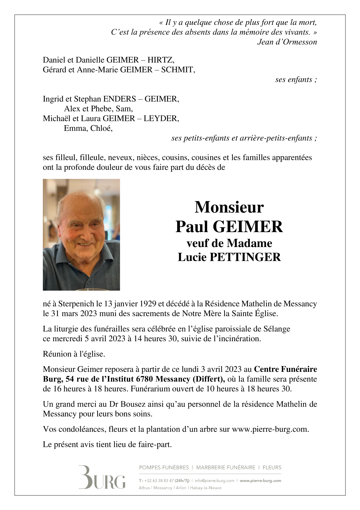 Décédé à Messancy (6780) le vendredi 31 mars 2023 à l'âge de 94 ans