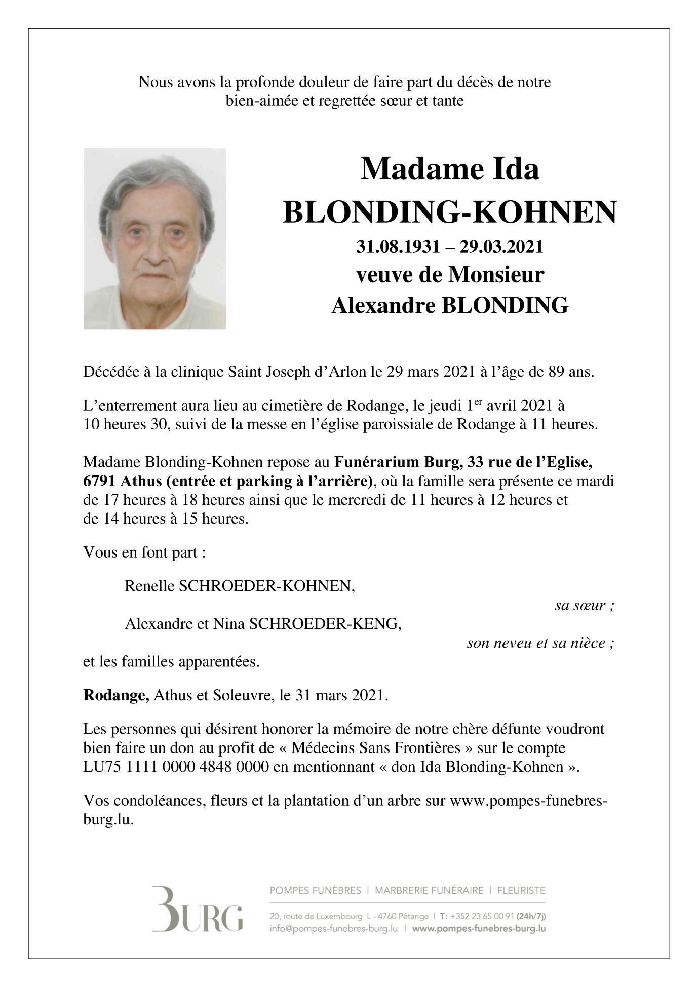 Décédée à Arlon (6700) le lundi 29 mars 2021 à l'âge de 89 ans