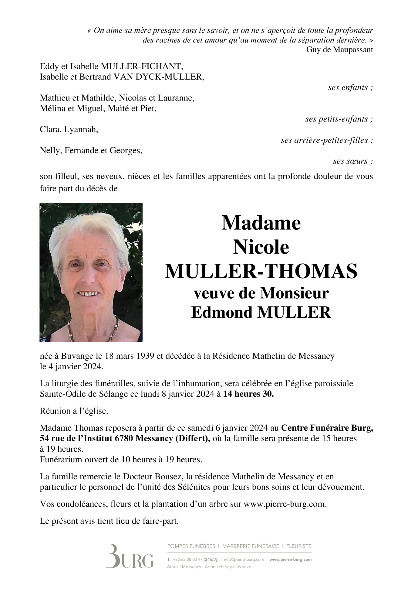 Décédée à Messancy (6780) le jeudi 4 janvier 2024 à l'âge de 84 ans