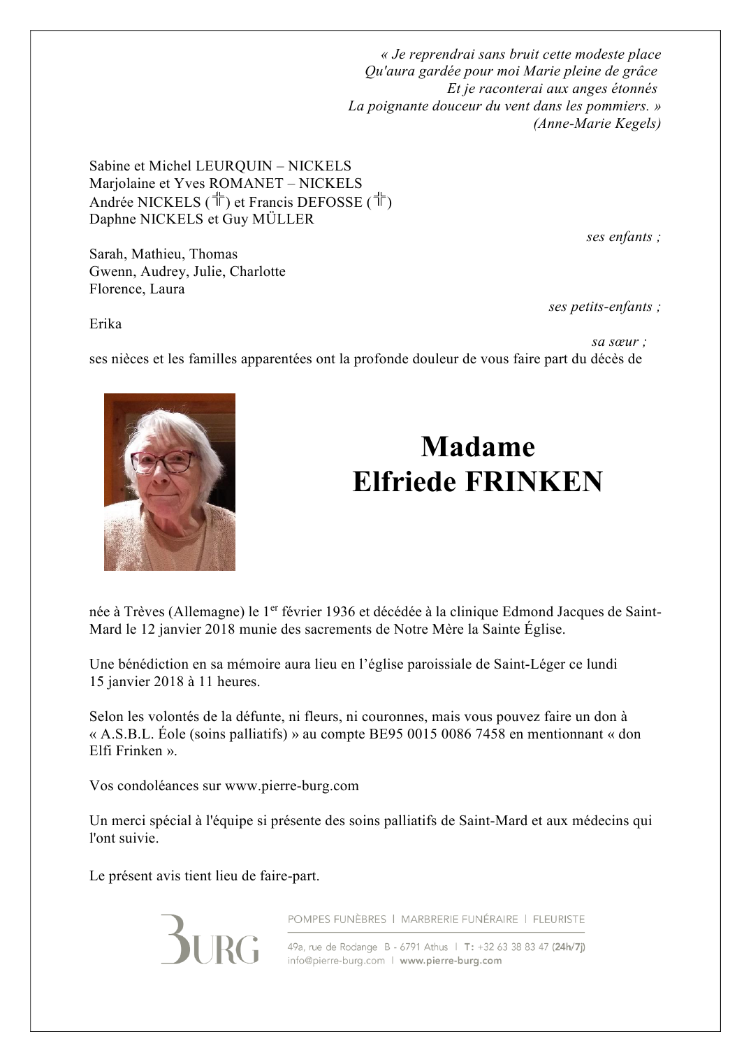 Décédée à Saint-Mard (6762) le vendredi 12 janvier 2018 à l'âge de 81 ans