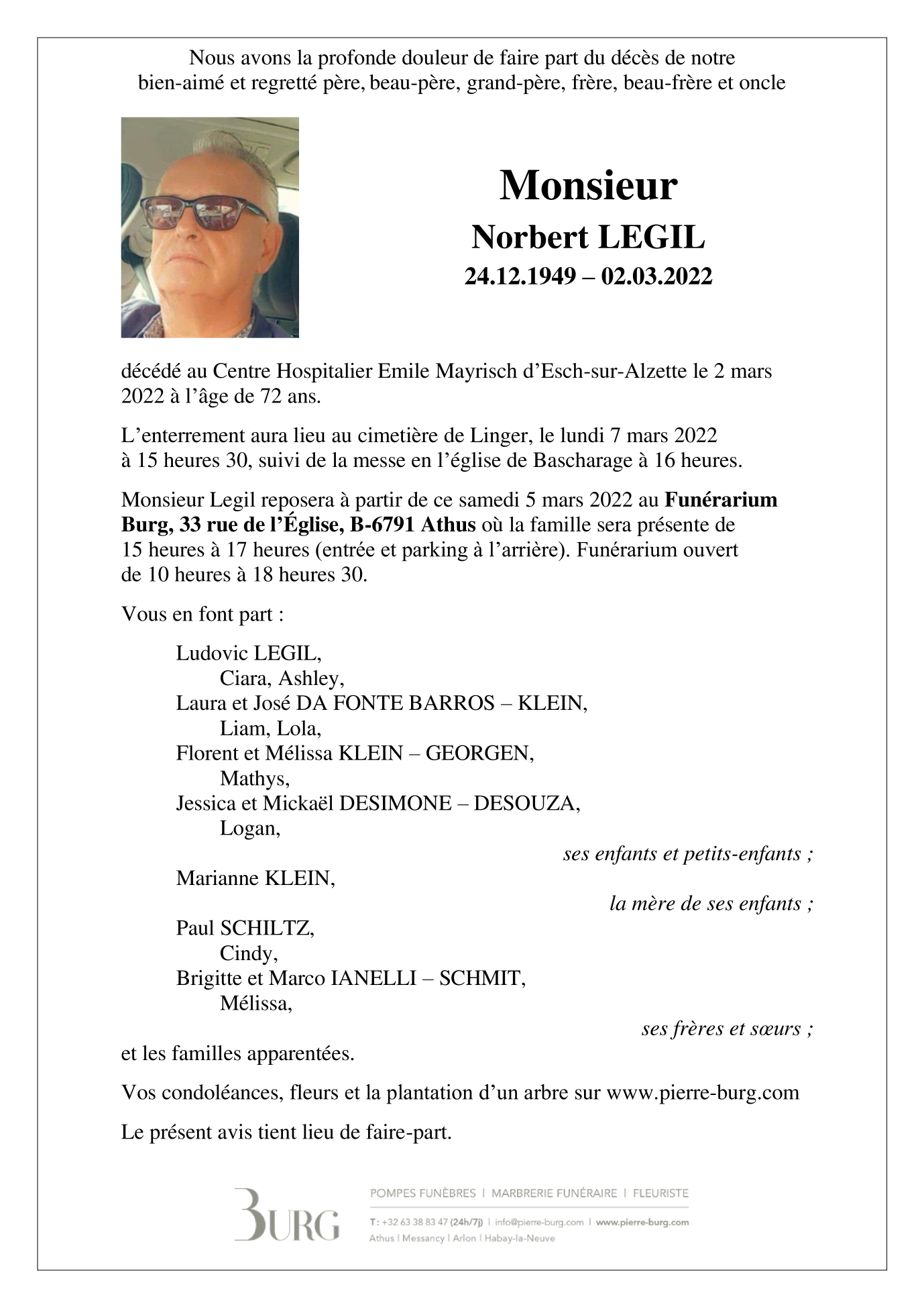 Décédé à Esch-Sur-Alzette/Mayrisch  (4240, Luxembourg) le mercredi 2 mars 2022 à l'âge de 72 ans