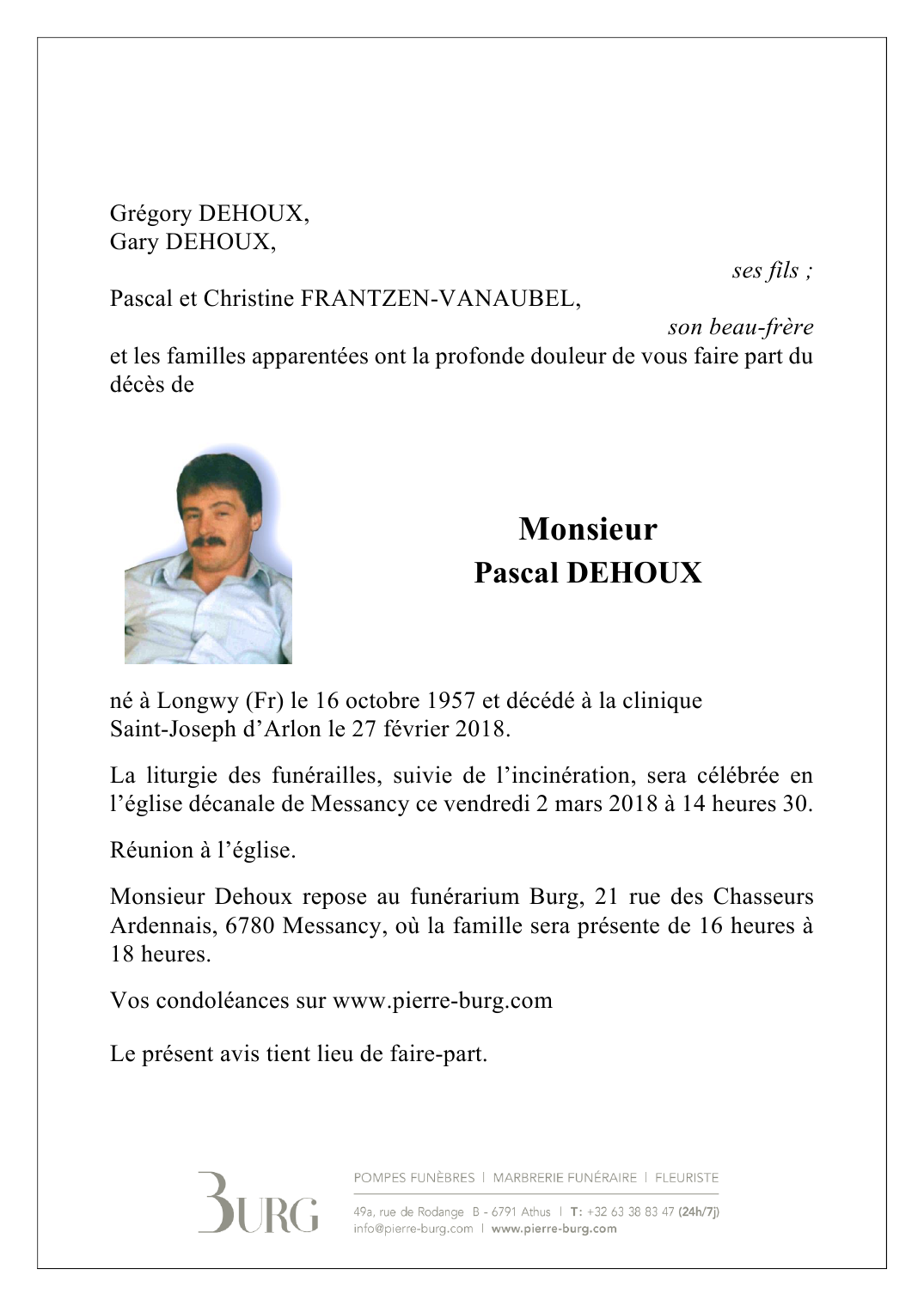 Décédé à Arlon (6700) le mardi 27 février 2018 à l'âge de 60 ans