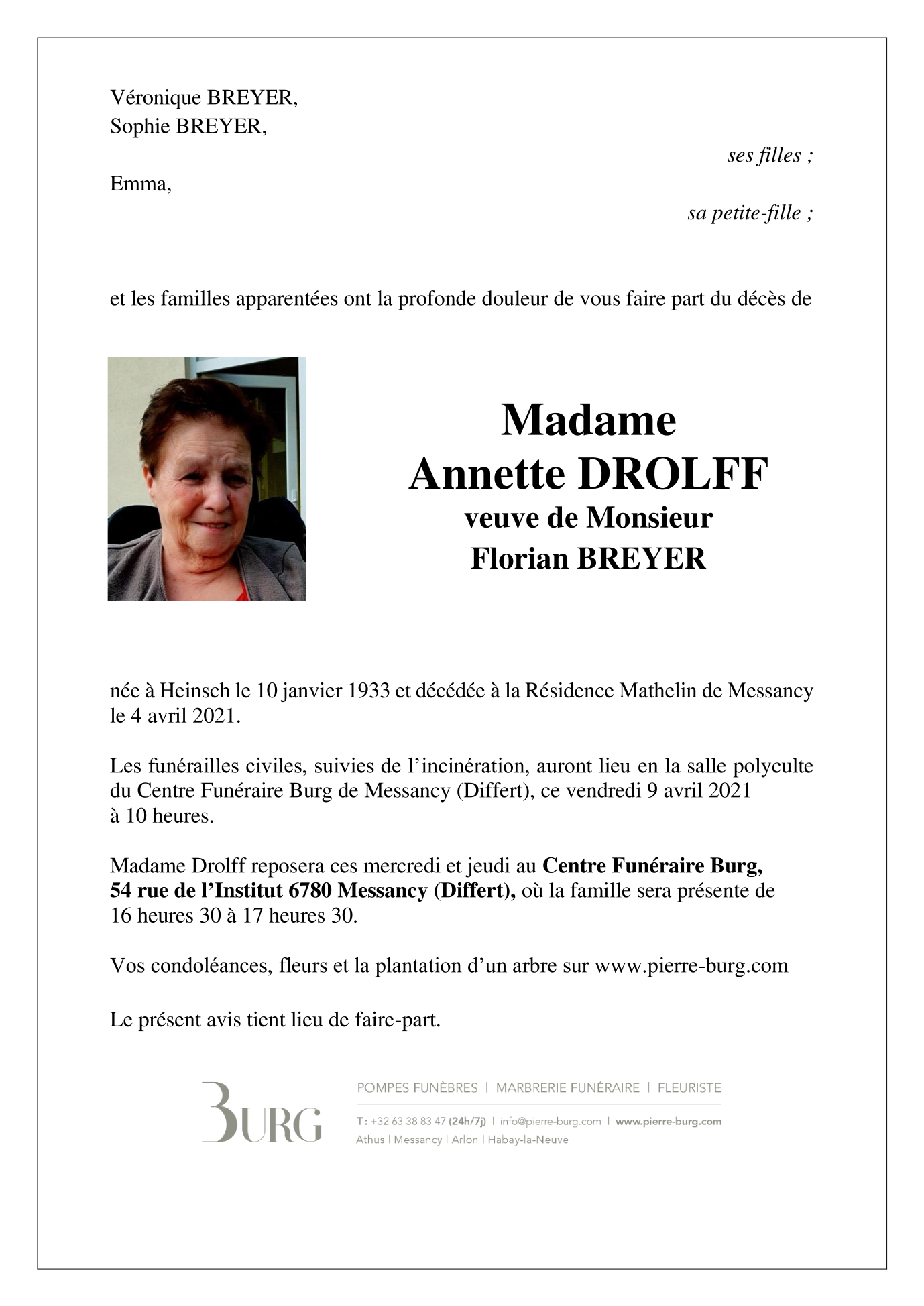 Décédée à Messancy (6780) le dimanche 4 avril 2021 à l'âge de 88 ans