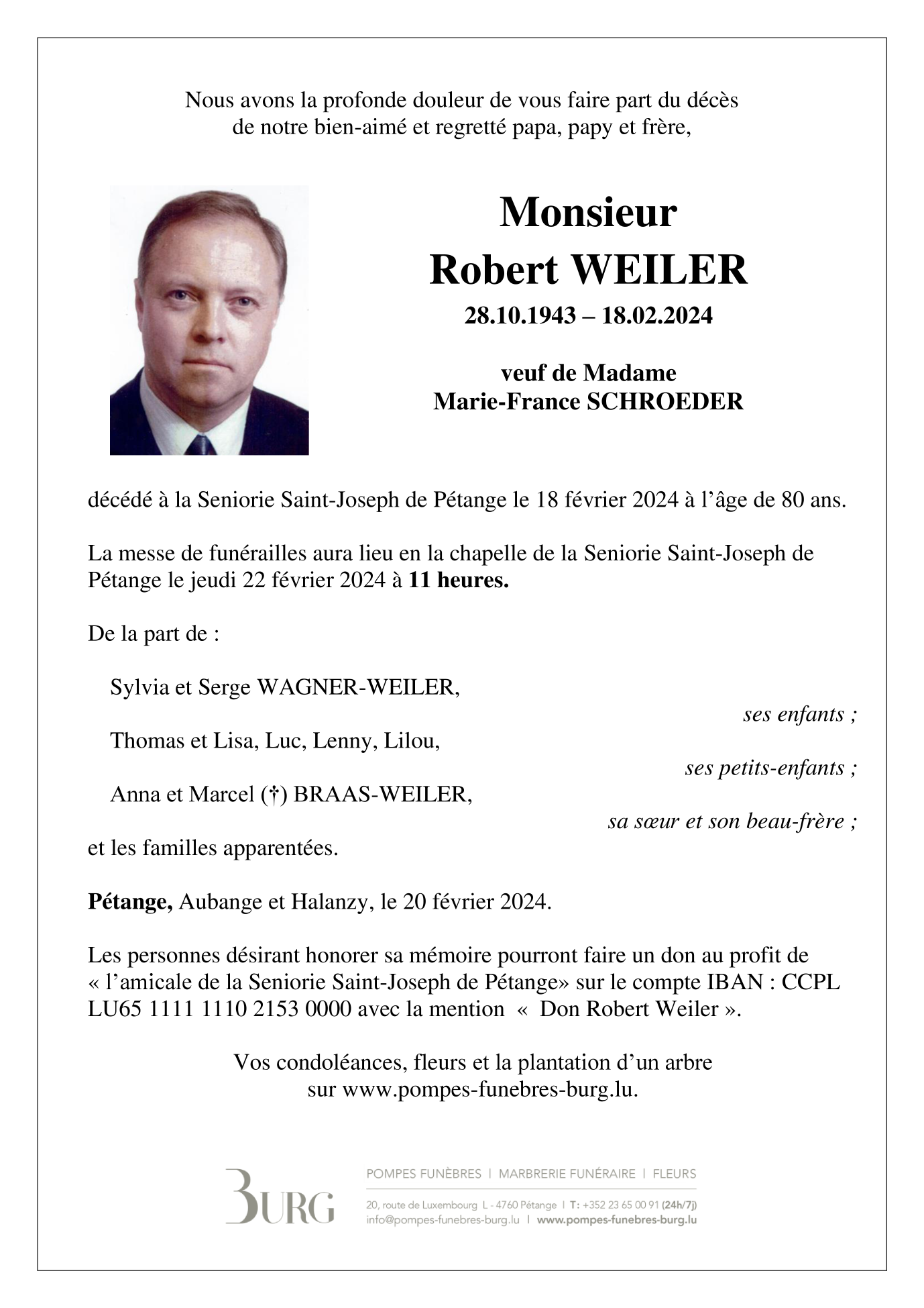 Né à Petange/Luxembourg  (4760, Luxembourg) le jeudi 28 octobre 1943