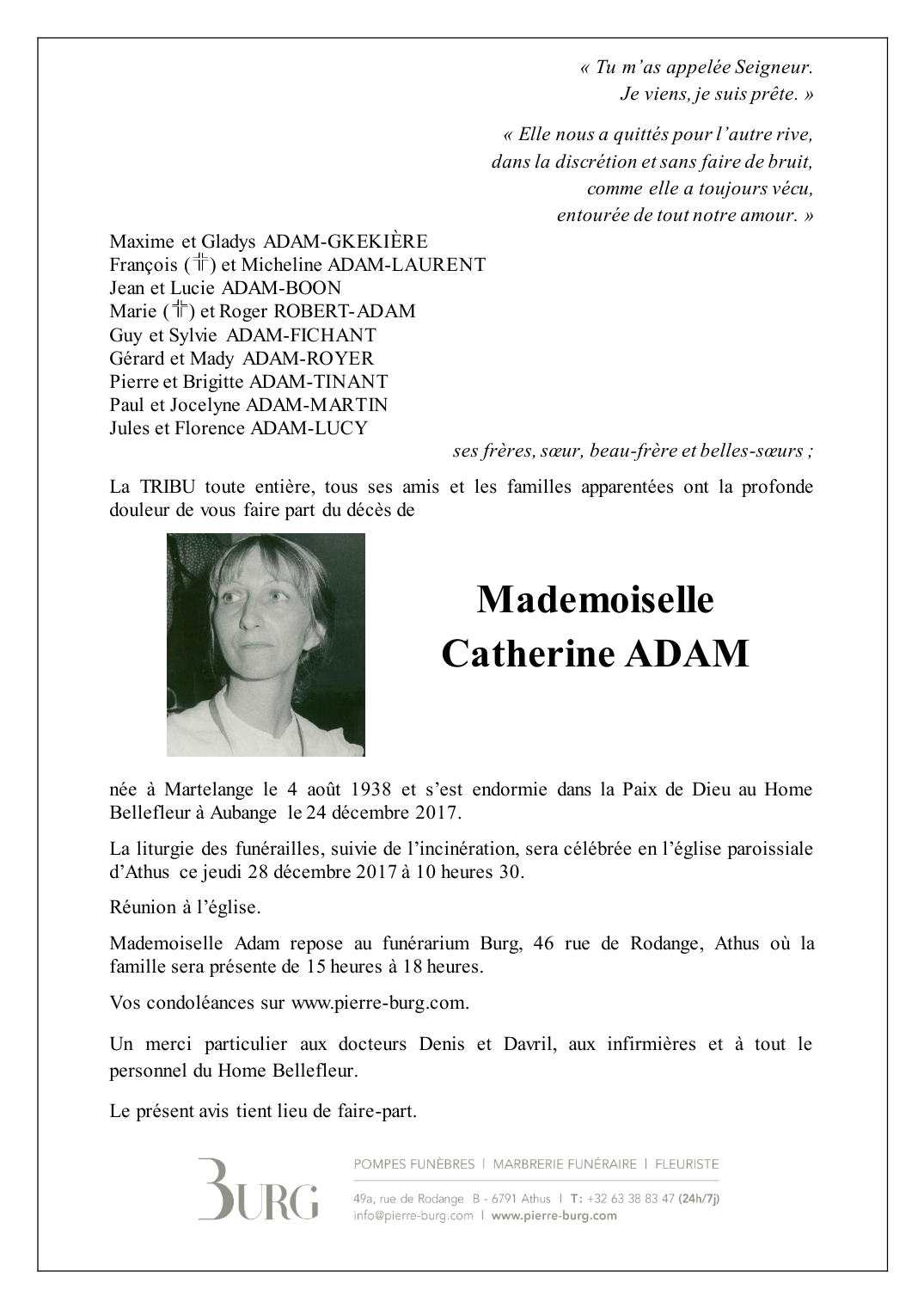Décédée à Aubange (6790) le dimanche 24 décembre 2017 à l'âge de 79 ans