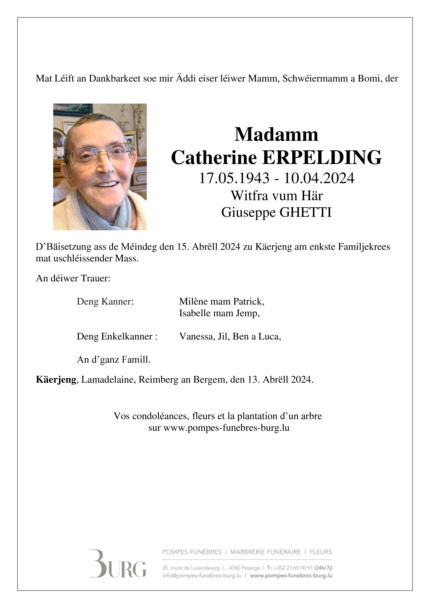 Décédée à Esch-Sur-Alzette/Mayrisch  (4240, Luxembourg) le mercredi 10 avril 2024 à l'âge de 80 ans