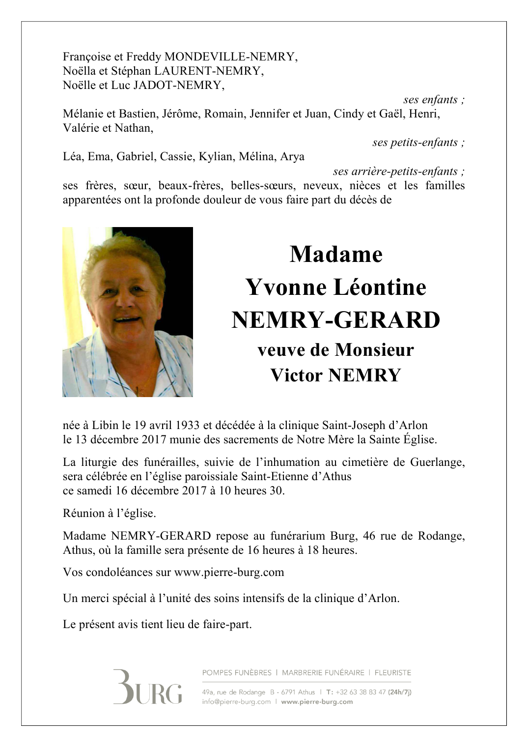 Décédée à Arlon (6700) le mercredi 13 décembre 2017 à l'âge de 84 ans