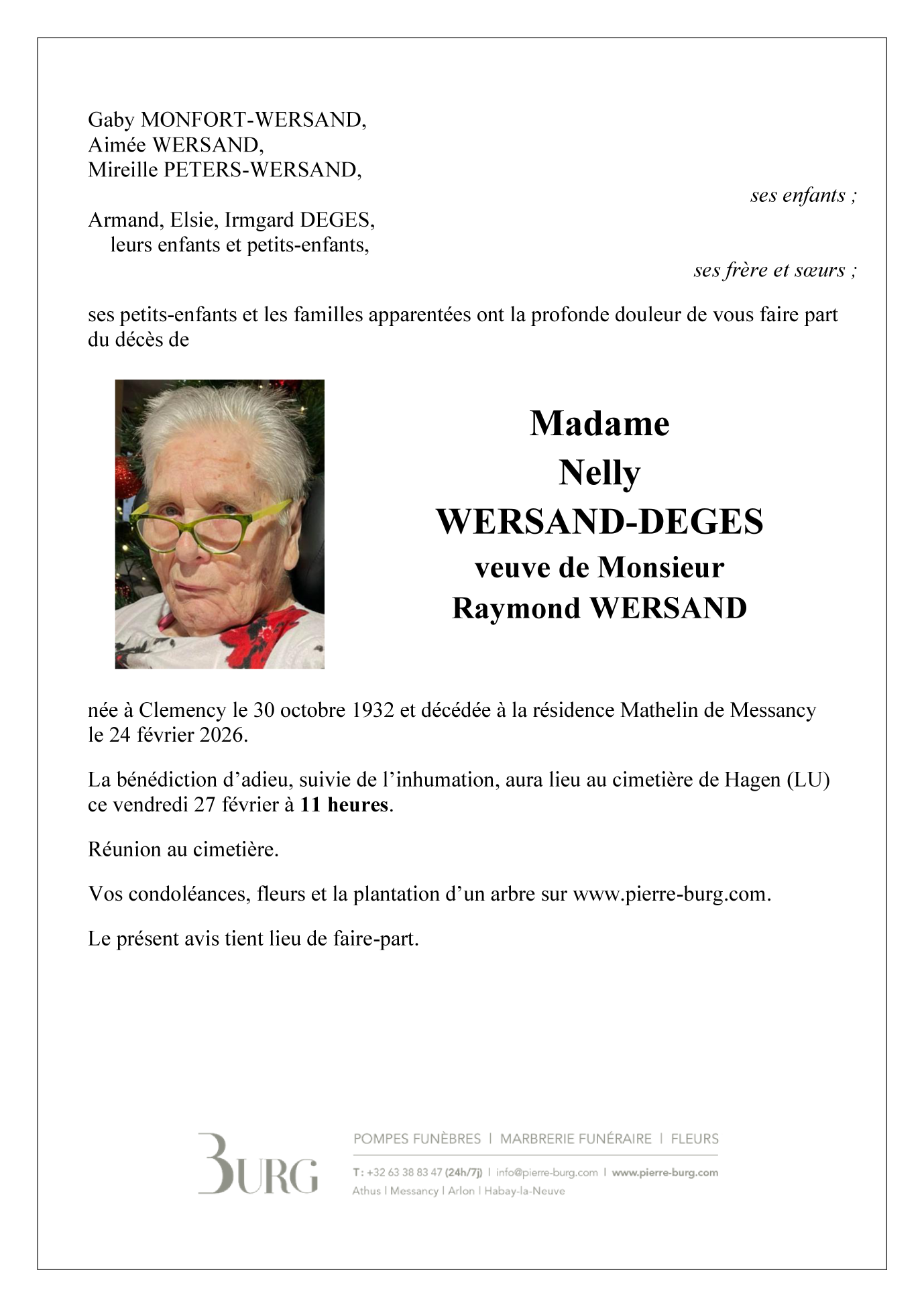 Décédée à Messancy (6780) le mardi 24 février 2026 à l'âge de 93 ans