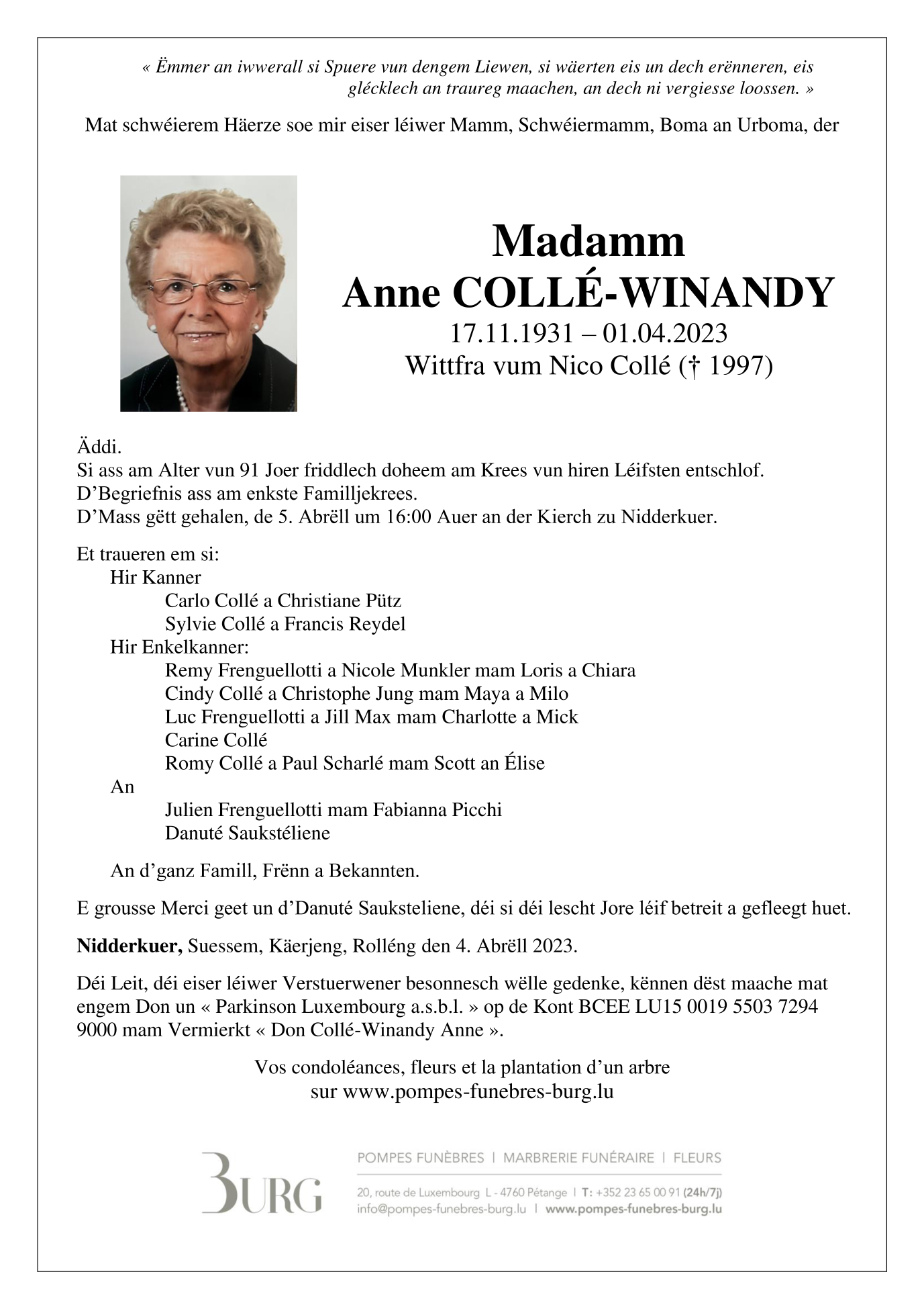 Décédée à Differdange/Bascharage  (4513, Luxembourg) le samedi 1 avril 2023 à l'âge de 91 ans