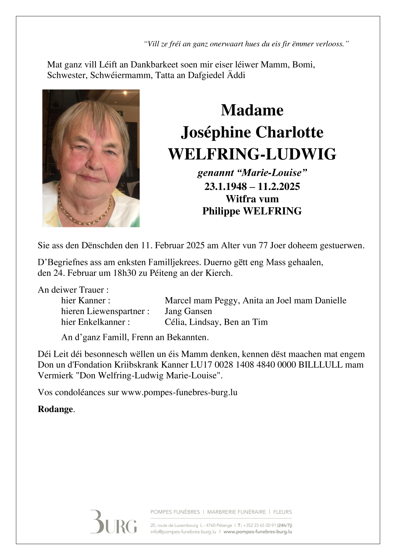 Décédée à Rodange/Fontaine  (4815, Luxembourg) le mardi 11 février 2025 à l'âge de 77 ans