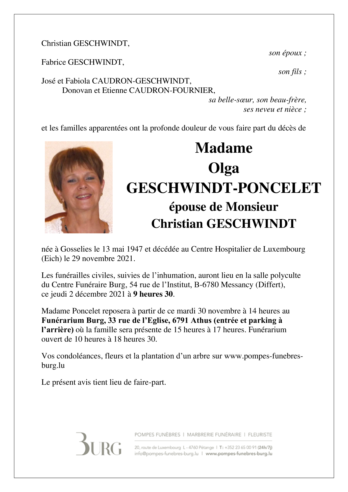 Décédée à Luxembourg/Eich  (1450, Luxembourg) le lundi 29 novembre 2021 à l'âge de 74 ans