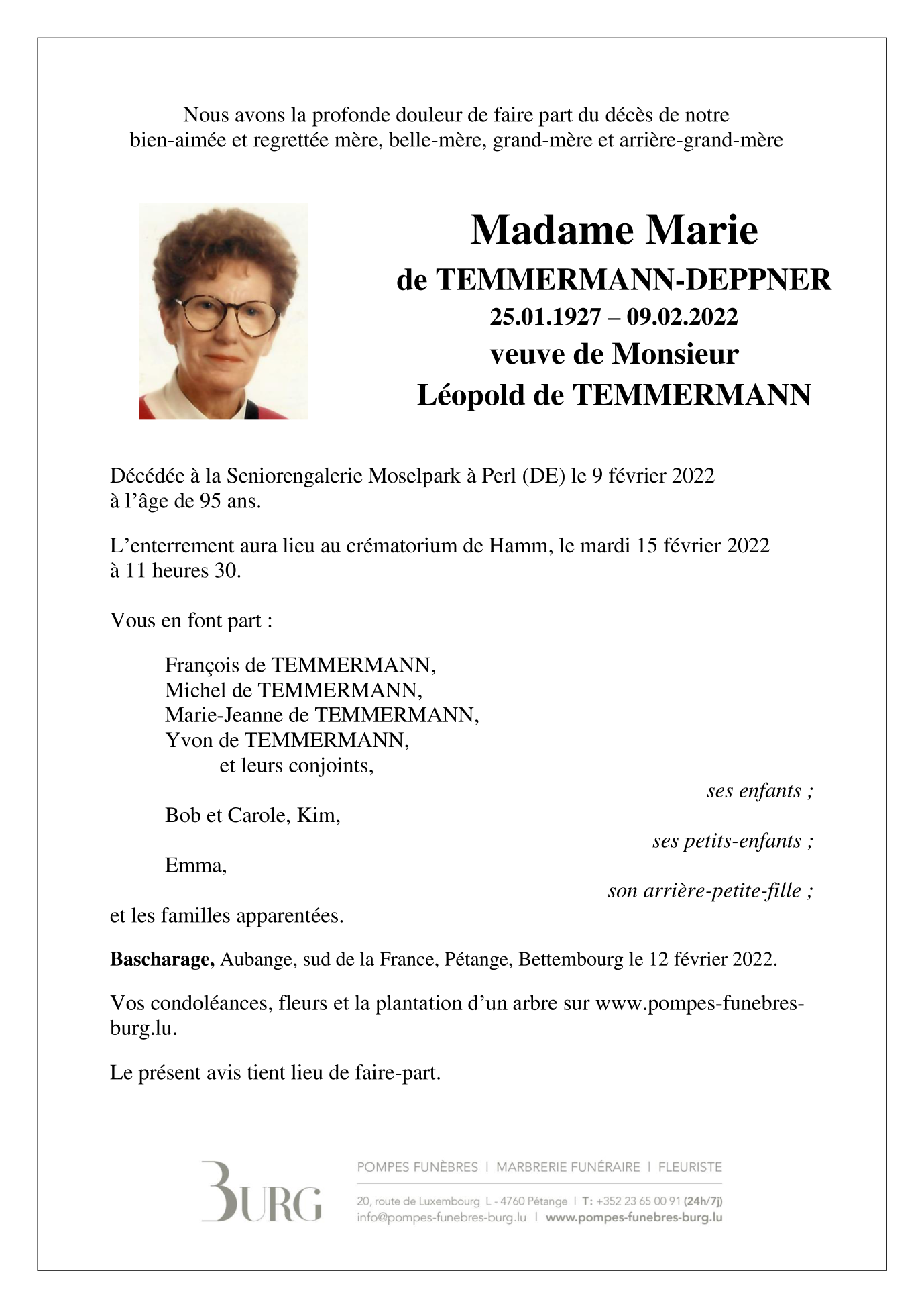 Décédée à Perl (66706, Allemagne) le mercredi 9 février 2022 à l'âge de 95 ans